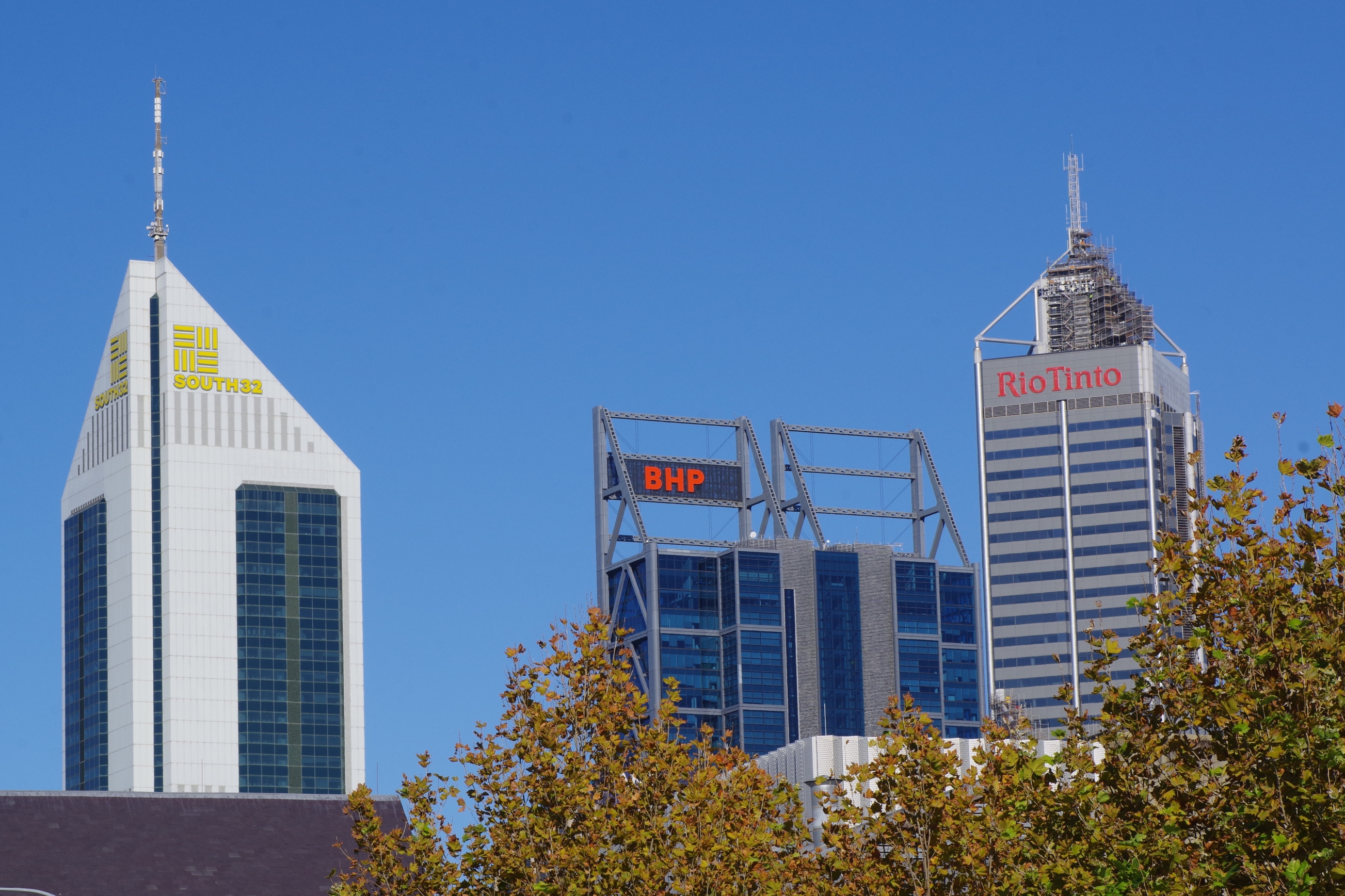 Drei der groessten Bergbaukonzerne dominieren die Skyline in Perth: