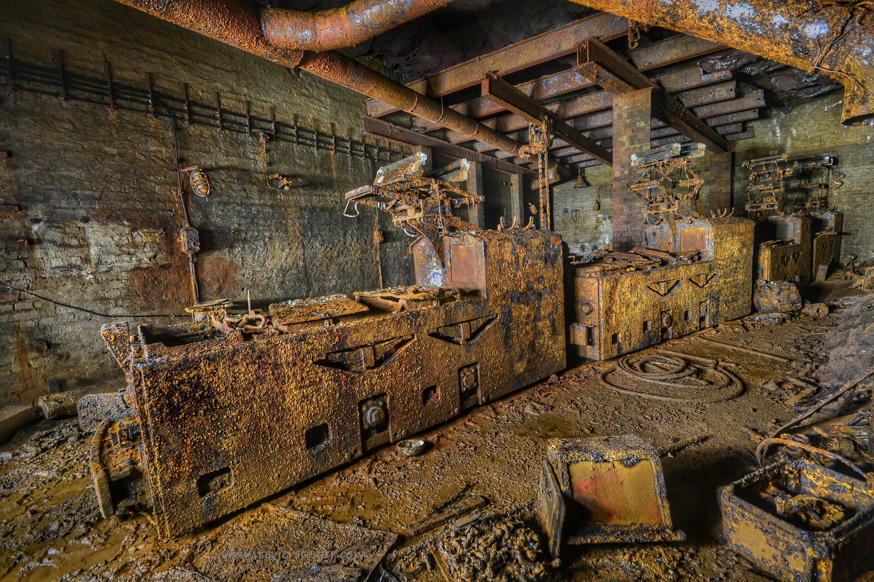 Vier Fahrdrahtloks EL 5 in der Untertagewerkstatt einer ehemaligen Eisenerzgrube, stillgelegt in den späten 1970er Jahren.