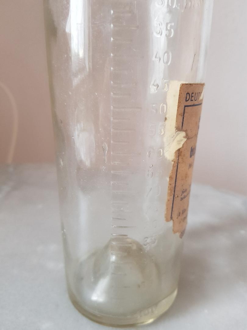 Die 1-Liter-Flasche hat an der Seite eine Maßeinteilung und im oberen Bereich eine umlaufende Beschriftung "Schneider & Berger Freiberg". Die Flasche selber dürfte nicht industirell gefertigt sein, da es im Glas selber Lufteinschlüsse gibt, der Boden uneben ist und einen Abriss besitzt.
