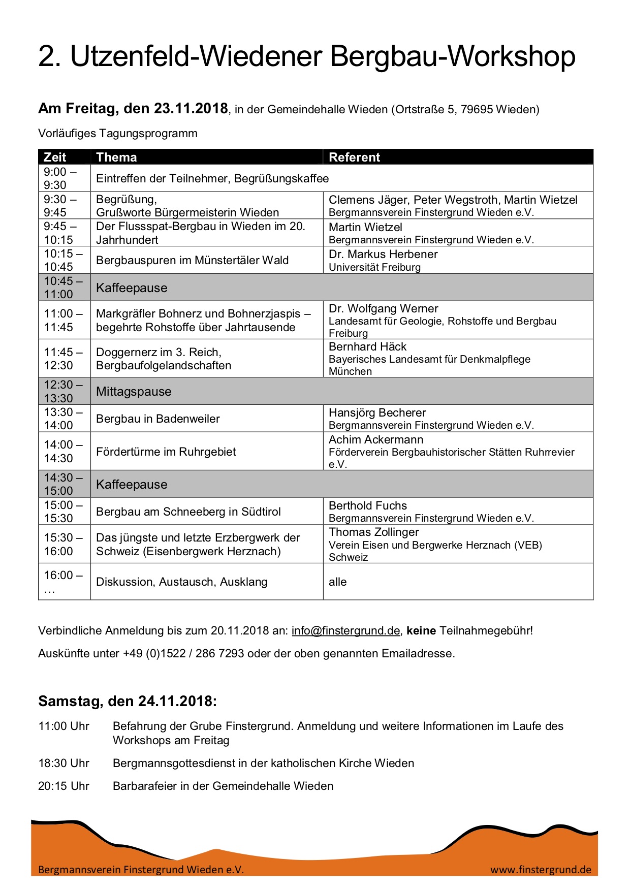anbei das Tagungsprogramm vom 23.10.2018 vom Workshop. Weiter ist das Tagungsprogramm um weitere Veranstaltungen ergänzt. Wer Interesse hat, kann am Samstag bei einer Befahrung der Grube Finstergrund teilnehmen.