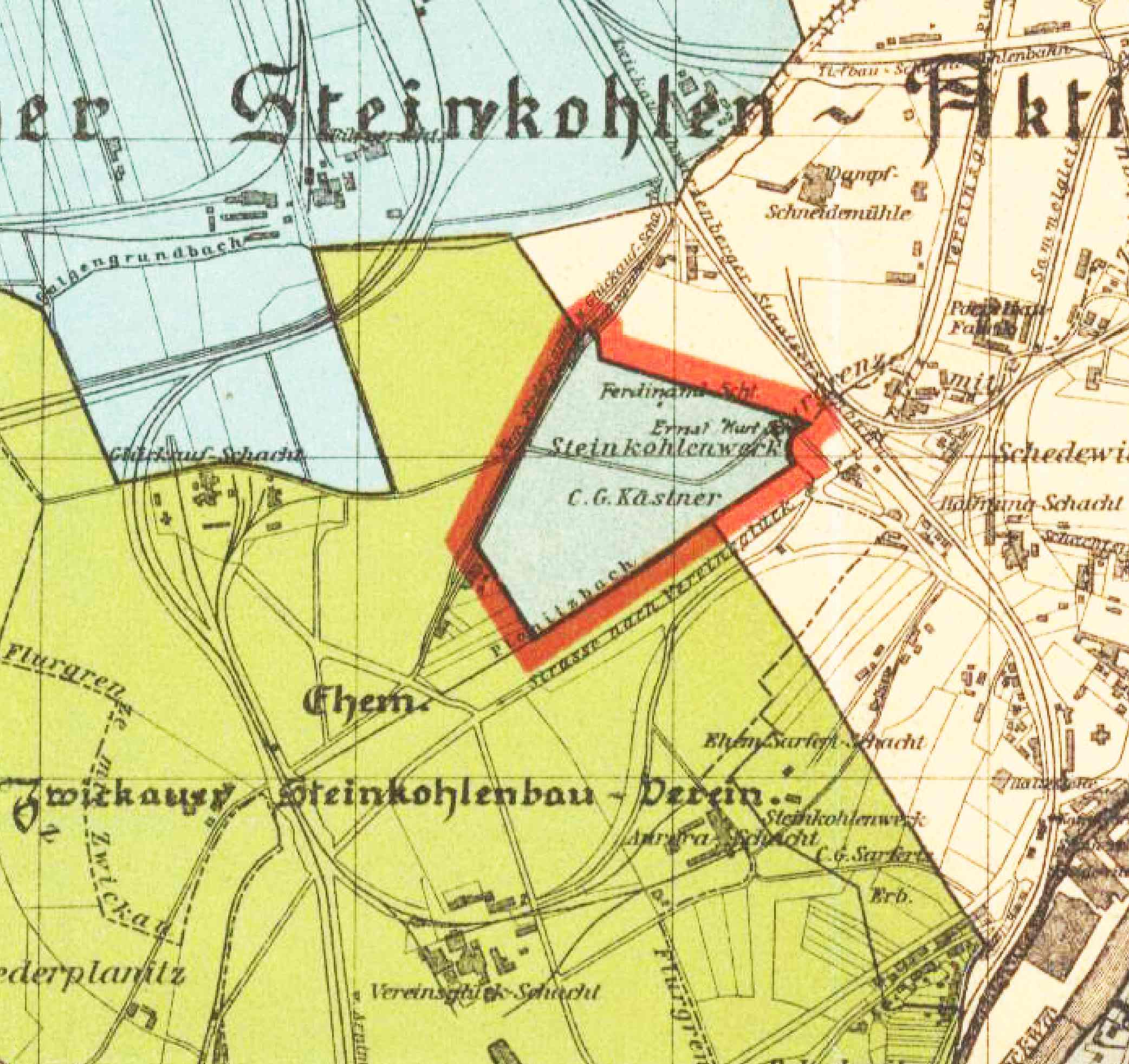 Ich habe mich jetzt weiter in die Sache reinvertieft. Die beiden Schächte des Stkw C.G. Kästner wurden 1903 geteuft und 1926/27 verfüllt, was bei einem so kleinen Grubenfeld nicht weiter verwundert. Lt. den Kollegen von der BerSi soll der infrage stehende Schacht auf Kupfer geteuft worden sein und auch nur 80 m erreicht haben. In den Erläuterungen zur CD des Zwickauer Steinkohlenbergbauvereines "Fotos aus dem Zwickauer Steinkohlenbergbau" heißt es: "der Ferdinandschacht hatte eine Teufe von 248 m und der Ernst-Kurt-Schacht eine Teufe von 282 m. Die Schächte lagen ca. 107 m von einander entfernt." Der oben von mir verlinkte "Plan von Zwickau" trägt das Ausgabejahr 1900, die beiden Schächte sind aber schon eingetragen. Allerdings beträgt hier der Abstand nur etwa die Hälfte (ich sitze am Laptop und kann nichts referenzieren oder exakt messen). Es gibt auf der CD ein Foto des Vereinsglückschachtes, von dessen Halde (jetzige Stadionhalde Westsachsenstadion) aus aufgenommen, auf dem im Hintergrund eigentlich die Gerüste der beiden Schächte zu sehen sein müßten. Das Foto soll etwa aus dem Jahre 1935 stammen. Es wäre theoretisch denkbar, daß sie zu dem Zeitpunkt bereits abgerissen waren. Allerdings sind alle diese Informationen sehr schlecht zuordenbar, da kaum eines der Fotos exakt datiert ist.