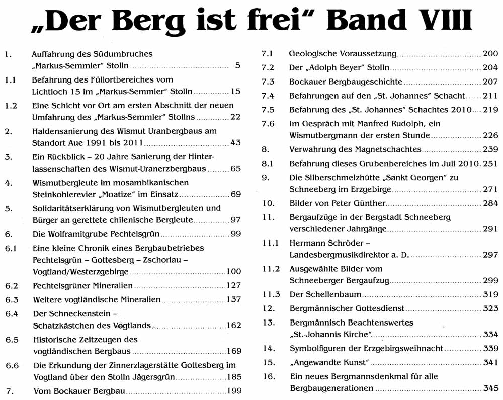 aus der Buchreihe „Der Berg ist frei – Bergbau im Erzgebirge“ von Siegfried Woidtke sind ab sofort die neuen Bände 6 bis 8 lieferbar. Die interessanten und abwechslungsreichen Themen können auf den beigefügten Inhaltsverzeichnissen eingesehen werden.