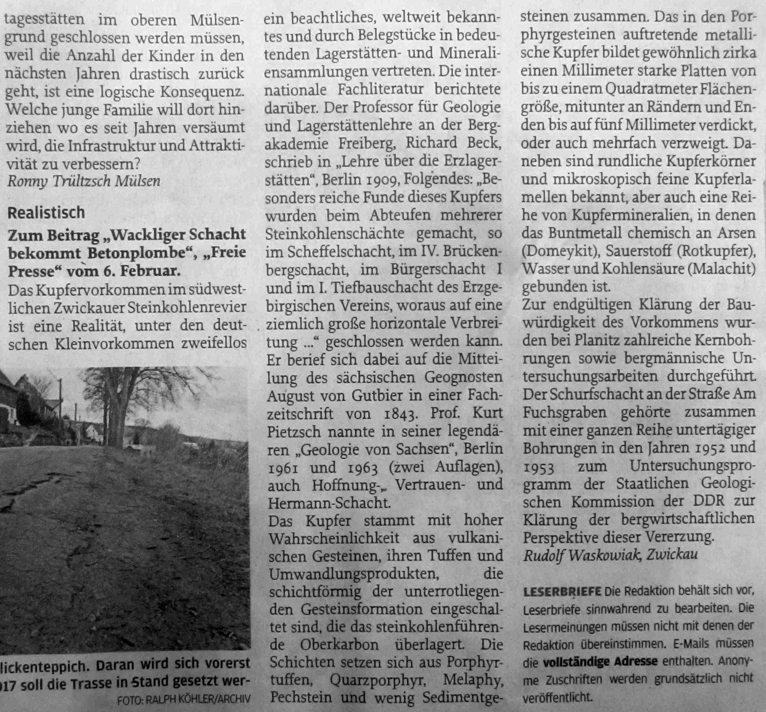 Ich glaube, jetzt hab ichs. Die "Freie Presse" führt hier alle in die Irre. Schon bei der Kupfergeschichte bin ich hellhörig geworden, denn im nicht allzuweit entfernten Bürgerschacht wurde beim Teufen gediegen Kupfer gefunden und wimre als "Unverhofft Glück Fundgrube" gemutet. Nun habe ich einen dazu passenden Text gefunden: "Die Teufarbeiten für den Bürgerschacht I des Aktienvereins der Zwickauer Bürgergewerkschaft begannen am 28.02.1842, Das in vielen einzelnen Etappen durchgeführten Teufen endete erst 1892 bei 414,8 m Tiefe. Die Verfüllung des Schachtes wurde 1961 abgeschlossen. Bei den Teufarbeiten wurden 1842 bei 83,0 m Teufe unregelmäßig geformten blechartigen Einlagerungen aus reinem Kupfer angetroffen. Die damaligen Untersuchungsarbeiten (Auffahren von 12 m Untersuchungsstrecke) wurden wegen zu geringer und zu unregelmäßiger Ausbildung der Einlagerungen wieder eingestellt. Die 1952/1953 durch den VEB Schachtbau Nordhausen erneut durchgeführten Untersuchungen bestätigten die Ergebnisse von 1842. Ein Abbau der Kupfereinlagerungen kam aus wirtschaftlichen Gründen nicht in Betracht." Hier wird zwar nicht dargestellt, welcher Art und wo die Untersuchungsarbeiten waren, aber die Teufenangaben (83 vs. etwa 80 m) passen zusammen. Also mehr oder weniger ein besseres U-Gesenk.