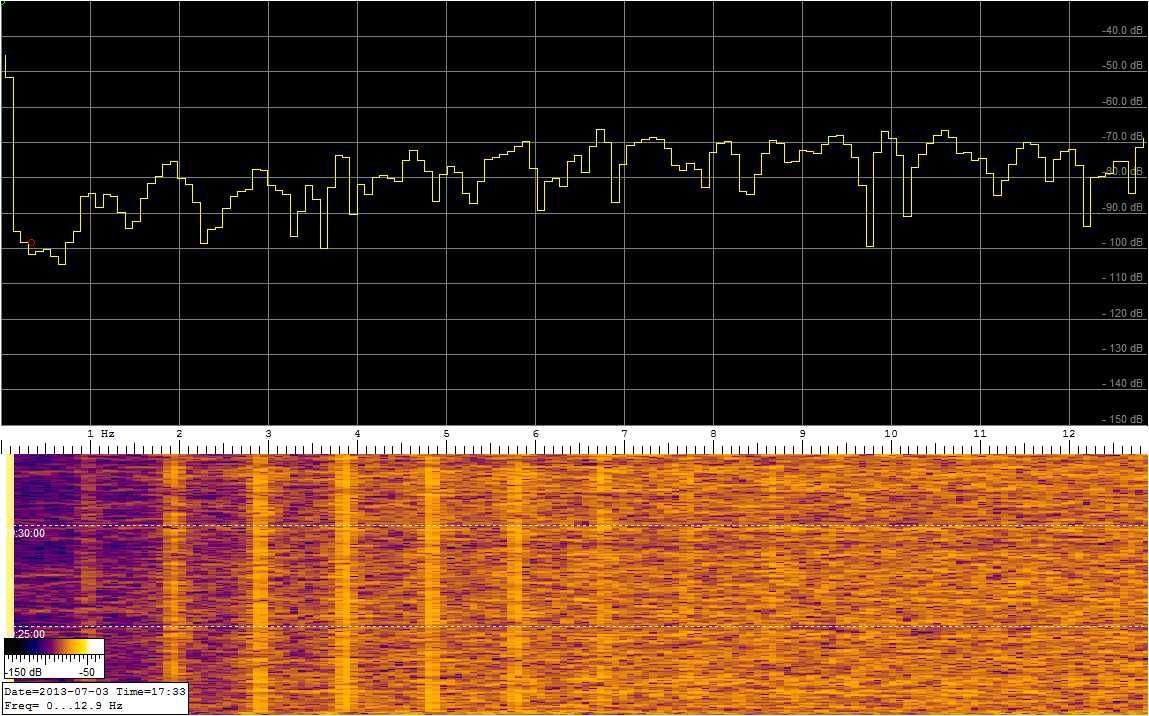 Das stärkste je von mir gemessene Beben fand am 7. Dezember 2012 in Japan statt und hatte die Magnitude 7,3. Am High-Gain Kanal (Nr. 2)des FBV war Clipping eingetreten, der Low-Gain Ausgang (Nr. 3) zeigte immer noch eine Amplitude von plus/minus 2,6 Volt. Hier zeigt sich, wie sinnvoll die Erweiterung der Schaltung in Version 2.0 ist. Ein Lob den Konstrukteuren!