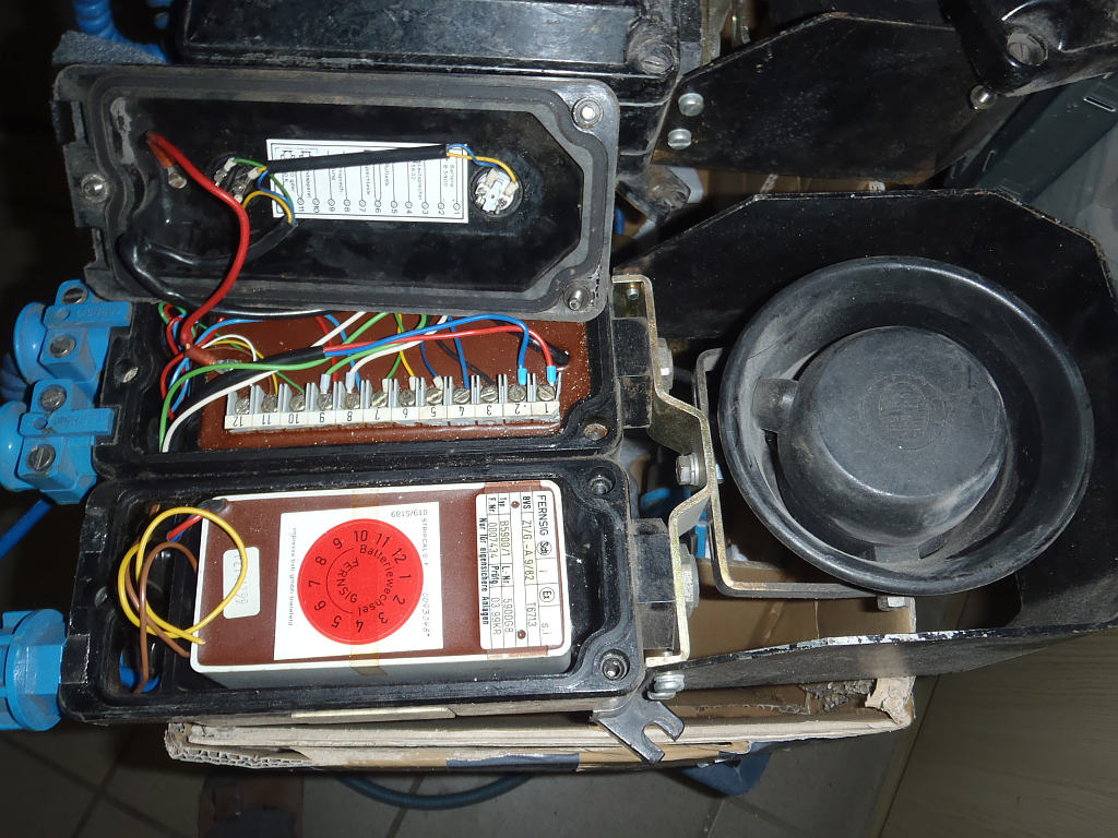 - Auf der rechten Seite befindet sich eine vergossene Batterie, mit Kennzeichnung B5900/1 und Prüfsiegel von 1999. Eine der Batterien hat noch 11,8V.