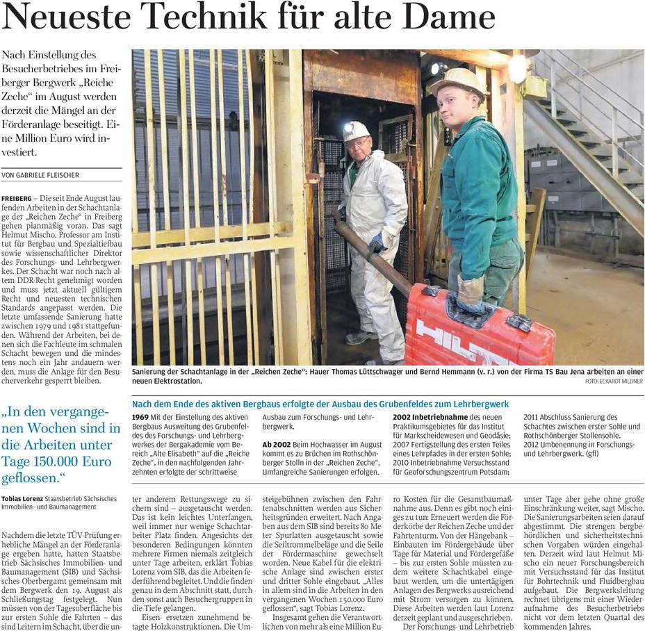 Freiberg. Der Besucherbetrieb im Lehr- und Forschungsbergwerk "Reiche Zeche" muss aus Sicherheitsgründen ab 19. August für etwa ein Jahr eingestellt werden. Darüber hat Freibergs Oberbürgermeister Bernd-Erwin Schramm (parteilos), der zugleich Vorstandsvorsitzender des Vereins Himmelfahrt-Fundgrube ist, am Donnerstag informiert. ...