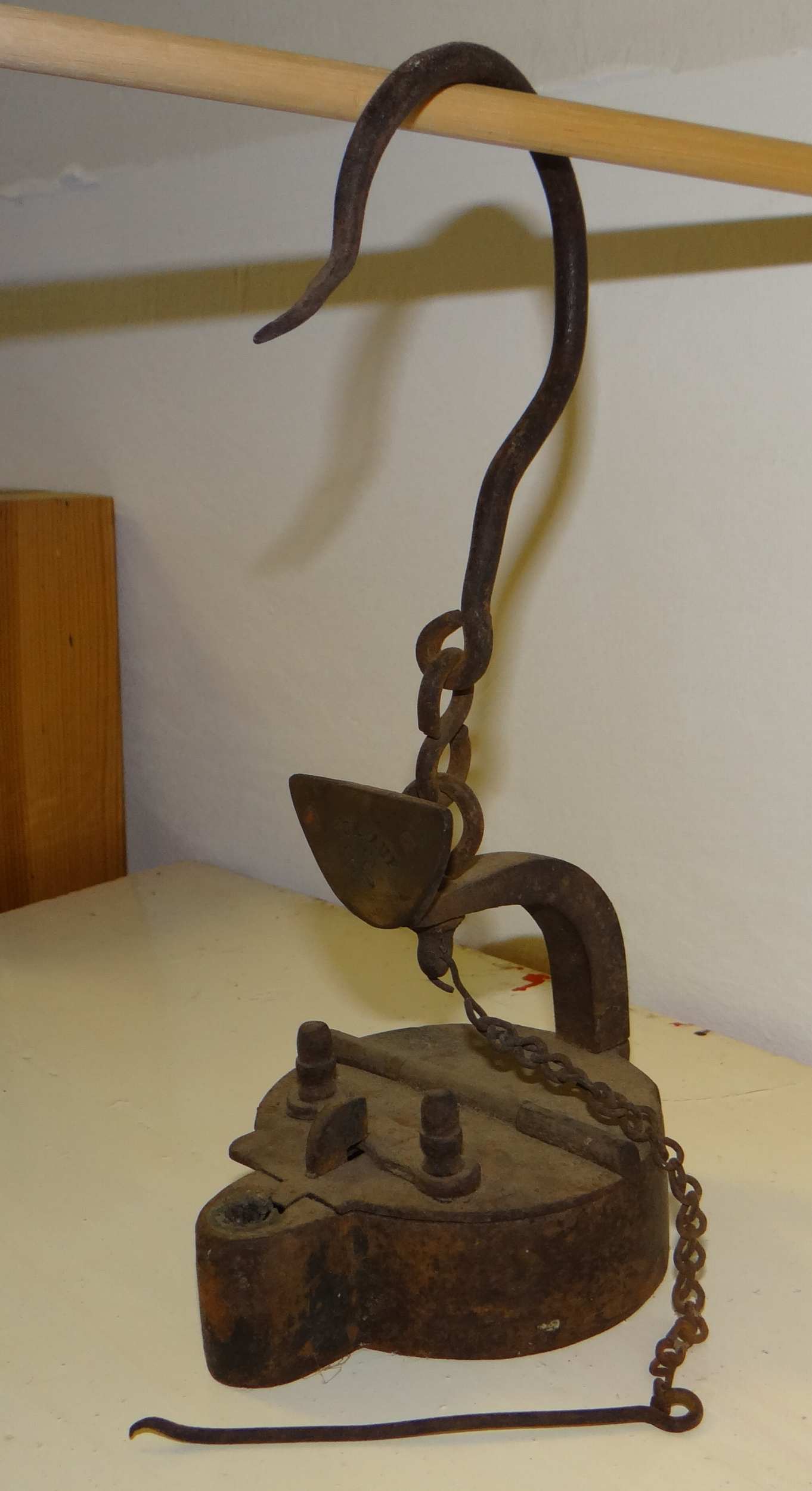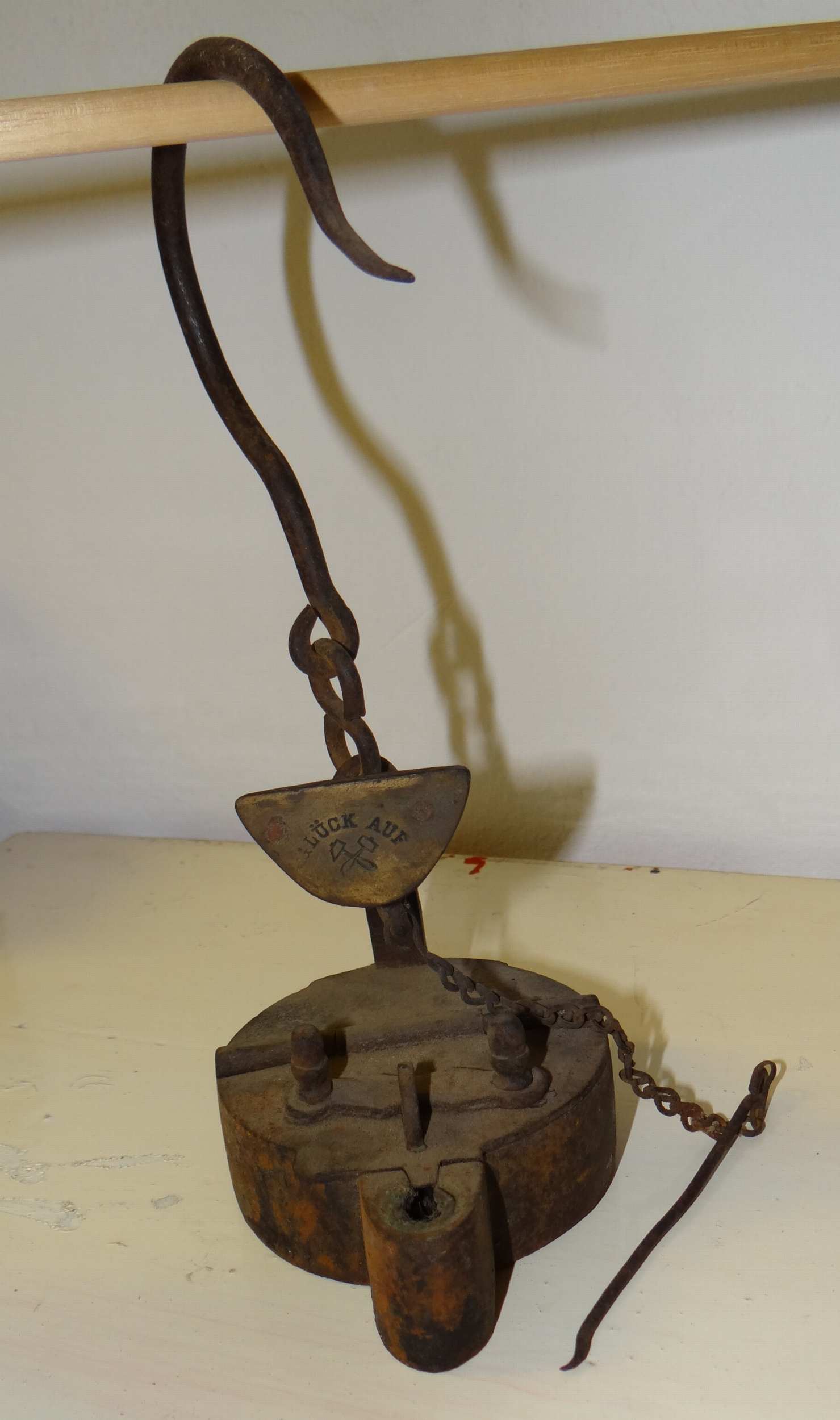 soll im Museum Veste Otzberg in einem neu zu gestaltenden Teil der Dauerausstellung, wo die Natur / Geologie rund um die Veste thematisiert werden soll, ausgestellt werden. Leider wissen wir nichts näheres zu Alter / Hersteller etc. Höchstwahrscheinlich war das Geleucht in einer der Gruben in der Umgebung im Odenwald im Einsatz. Auf der Unterseite ist wohl eine 16 eingeprägt.