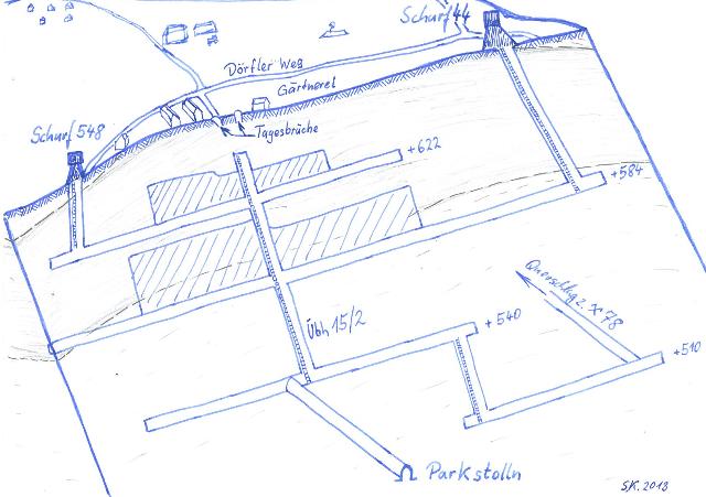 Also alle Brüche der 1960/70ziger Jahre auf dem Gelände zwischen Gärtnerei und dem Schurf 548 liegen unmittelbar über den Abbaublöcken 29, 30 und 31 der Wismut, welche jeweils über der 622 Meter Sohle angelegt waren. Sagen wir, dort wurden noch mal 10 Meter bebaut, dann waren da keine 15 Meter Bergfeste mehr. Man braucht kein Hellseher zu sein, dass man ohne etwas Nachhaltigem an dieser Stelle nicht auskommen wird. Diese Sohle ist sicher dabei der Knackpunkt.
