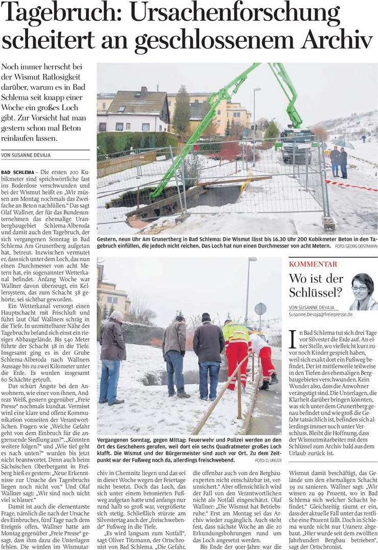 Es ist schon schlimm was der Herr Wallner hier so von sich gibt. Erst ist es ein Bunker. Bunker hatte der Schacht. Auf dem Farbphoto vom 30.12. schön zu sehen. Allerdings waren diese Bunker überirdisch und aus Holz. Hier wurde das geförderte Erz gebunkert und mittels LKW abgefahren. Dann ist es ein Keller. Ein Keller der 10 m tief ist? Sehr merkwürdig. Wenn es ein Keller wäre hätte er eine massive Betondecke und diese würde auch nach der Zeit nicht so einfach einstürzen. Jetzt zaubert er einen Wetterkanal aus dem Ärmel. Der Schacht wurde auch als einziehender Frischwetterschacht genutzt. Da ist ein Wetterkanal nicht unbedingt üblich. Dazu kommt, das der Wetterkanal ja auch eine Tagesöffnung braucht. Diese müßte dann ja irgendwoh vor den Siedlungshäusern sein? Aber auch ein Wetterkanal ist nicht 10 m tief. 4 x 4 m sind da schon sehr groß. Altbergbau in dieser Größenordnung halte ich an dieser Stelle für eher unwahrscheinlich. Wie wäre es denn damit. Der Schacht ist nicht weit entfernt. Stillgelegt wurde er 1973. Das Schachtgelände selber wurde erst mitte der achziger Jahre beräumt. Der Schacht Er wurde 1987 mit einer Betonplombe gesichert, die ist ja aber üblicherweise nicht in großer Tiede, sondern dort wo der standfeste Fels beginnt. Also 10-20 m tief. Der Schacht war in den obersten 15 m mit Beton ausgebaut. Darunter stand er in Vollschrot. Die Frage ist, ob der Schacht überhaupt verfüllt wurde und wenn ja wie gründlich. Ein Schachtbruch unterhalb der Betonplombe kann auch auf die Umgebung Auswirkungen haben. Mal sehen was die Fachleute noch so an Varianten ausgraben.