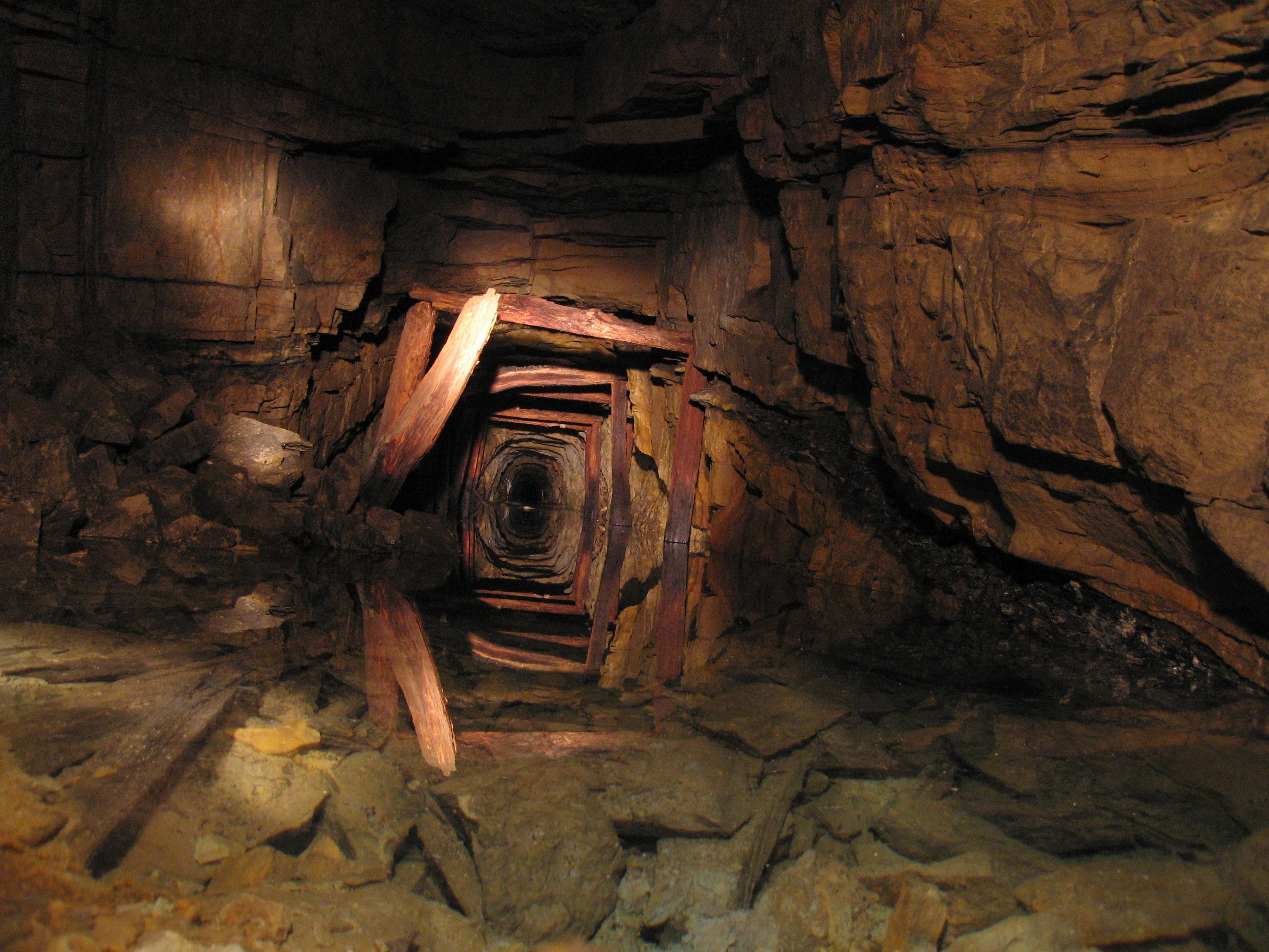 Faulender Türstock in einer Streckengabelung im Thüringer Schieferbergbau