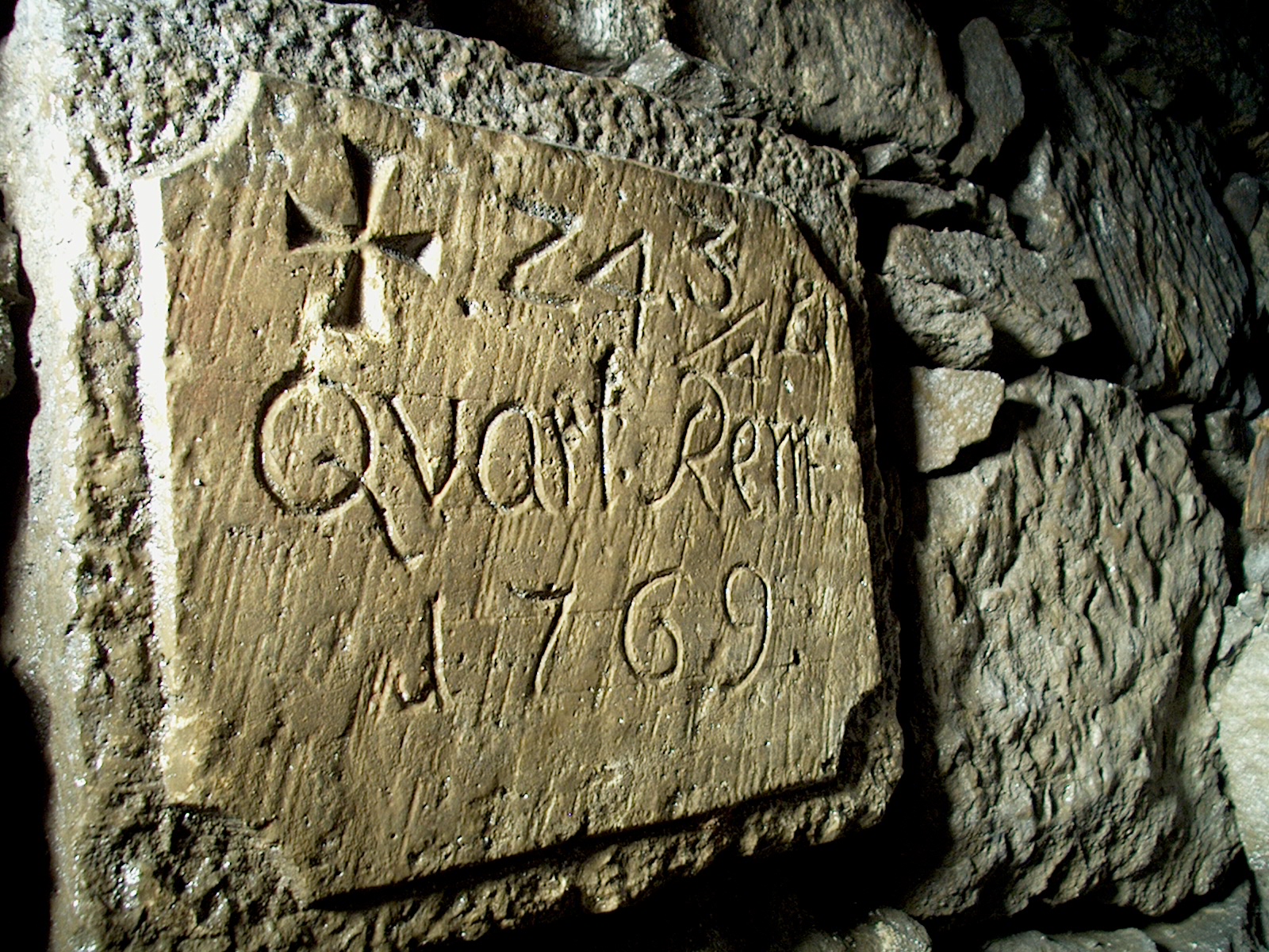Quartalstafel für das Errichten eines Gewölbes. Es gab davon 5 Stück. Dies ist die jüngste und letzte in der Reihe. Und die erste die "gesichert" wurde. Man hat sie, nicht lange Zeit nachdem dieses Foto entstanden ist, zum Schutz gegen Diebstahl aus dem Gewölbe entfernt und gegen eine Kopie aus Gips ersetzt (Gaaaaanz tolle Idee! -Gips im Wasserlösungstollen.) Heute gibt es die Stelle gar nicht mehr, da der Stollen "saniert" wurde, also ein Damm errichtet, KG Rohr für den Wasserabfluss rein und dann Kraftschlüssig bis unter die Firste mit Beton verfüllt.