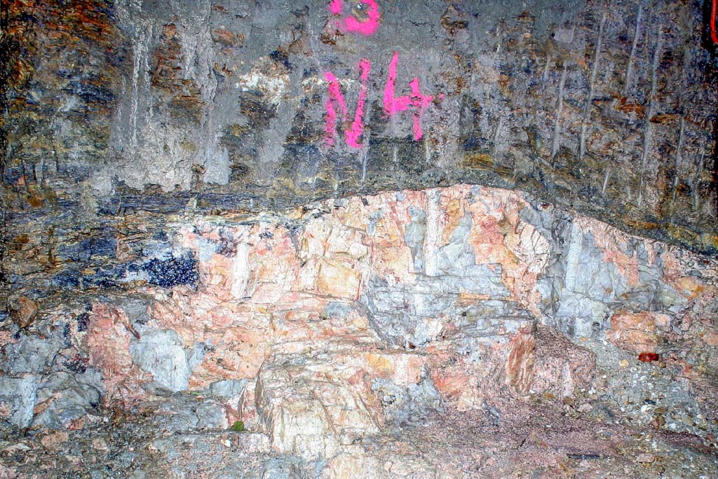 Stockscheider (Magnetstolln Zschorlau Befahrung im Juli 2010) Kontaktzone Phyllit oben und Granit unten. Magnetstolln ist verwahrt, mit Beton zugepumpt.