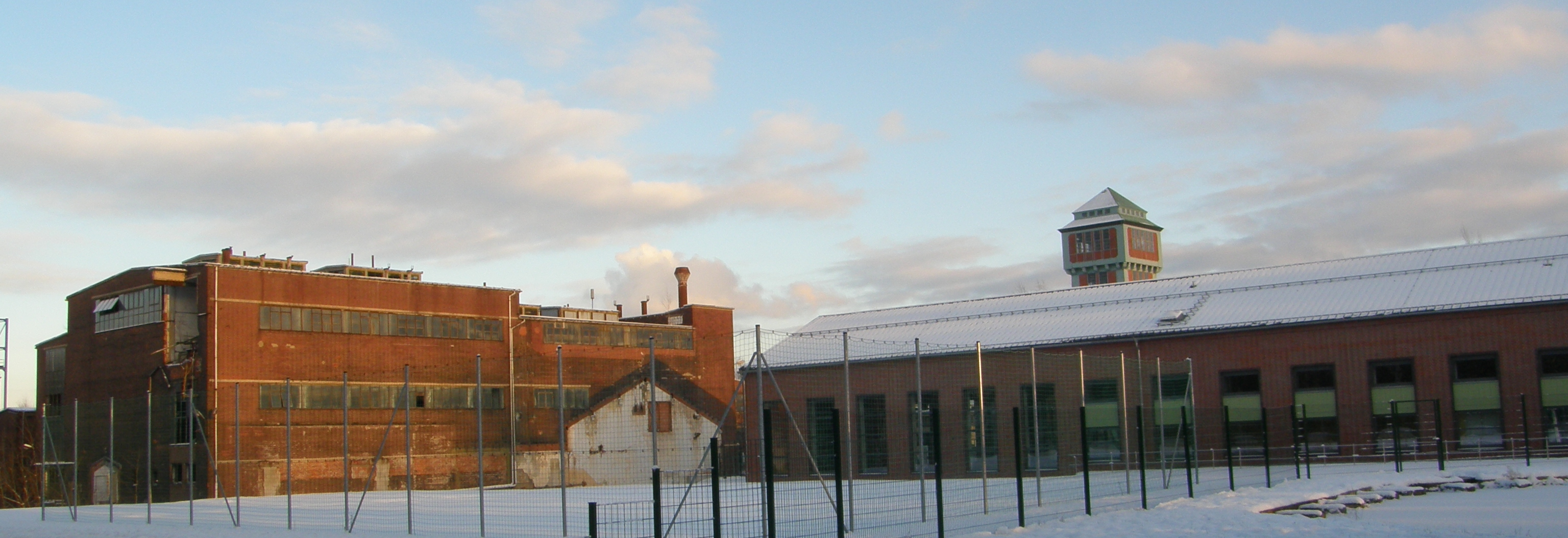 Das alte Kraftwerk des KLW in Neuoelsnitz mit dem Kesselhaus links und dem Turbinenhaus (jetzt ein Schwimmbad) rechts.