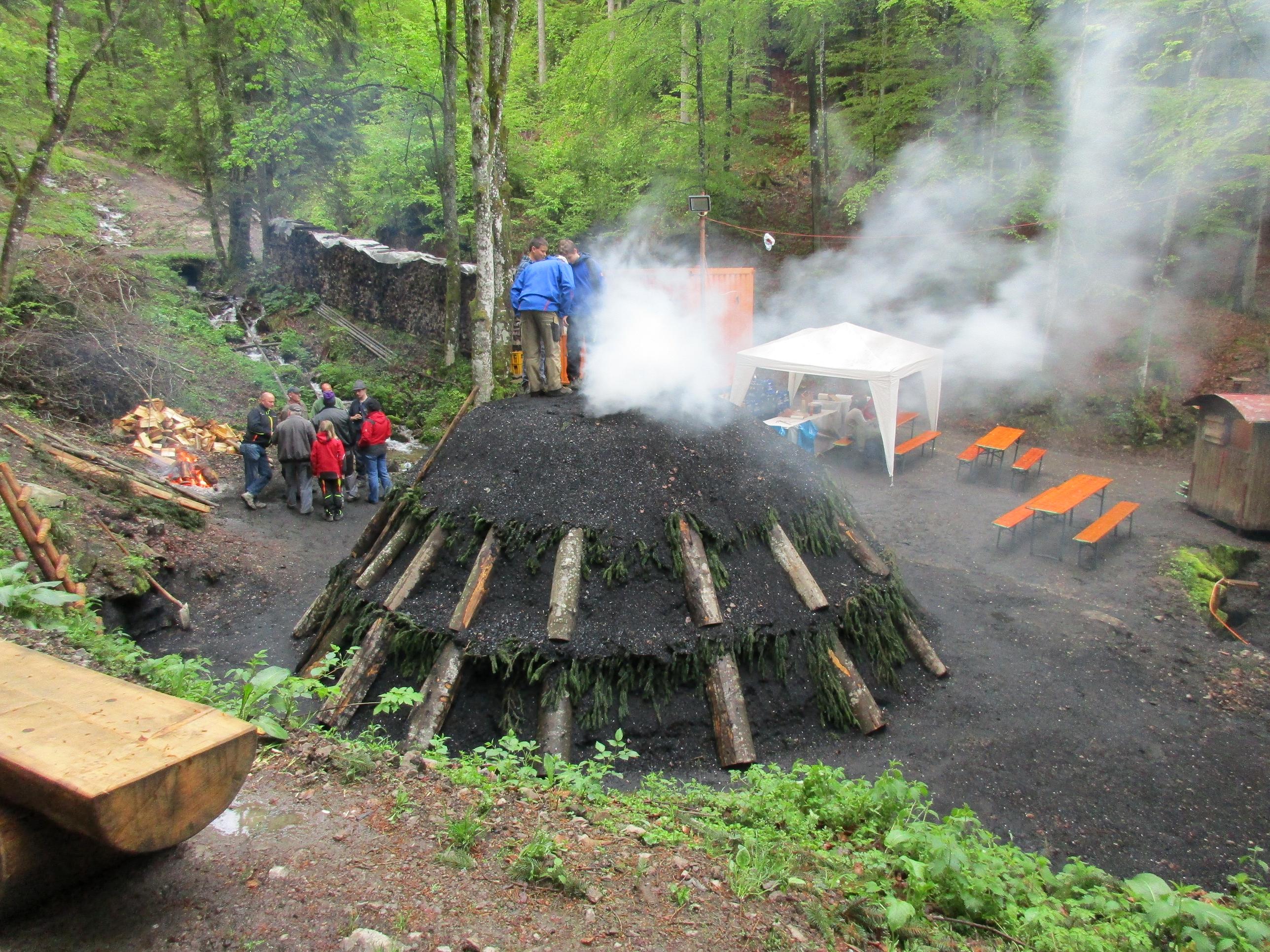 Nachfolgend ein Bild vom Kohlenmeiler welcher direkt am Pfingstsamstag am Morgen oberhalb unseres Besucherbergwerkes in Glut gesteckt wurde.