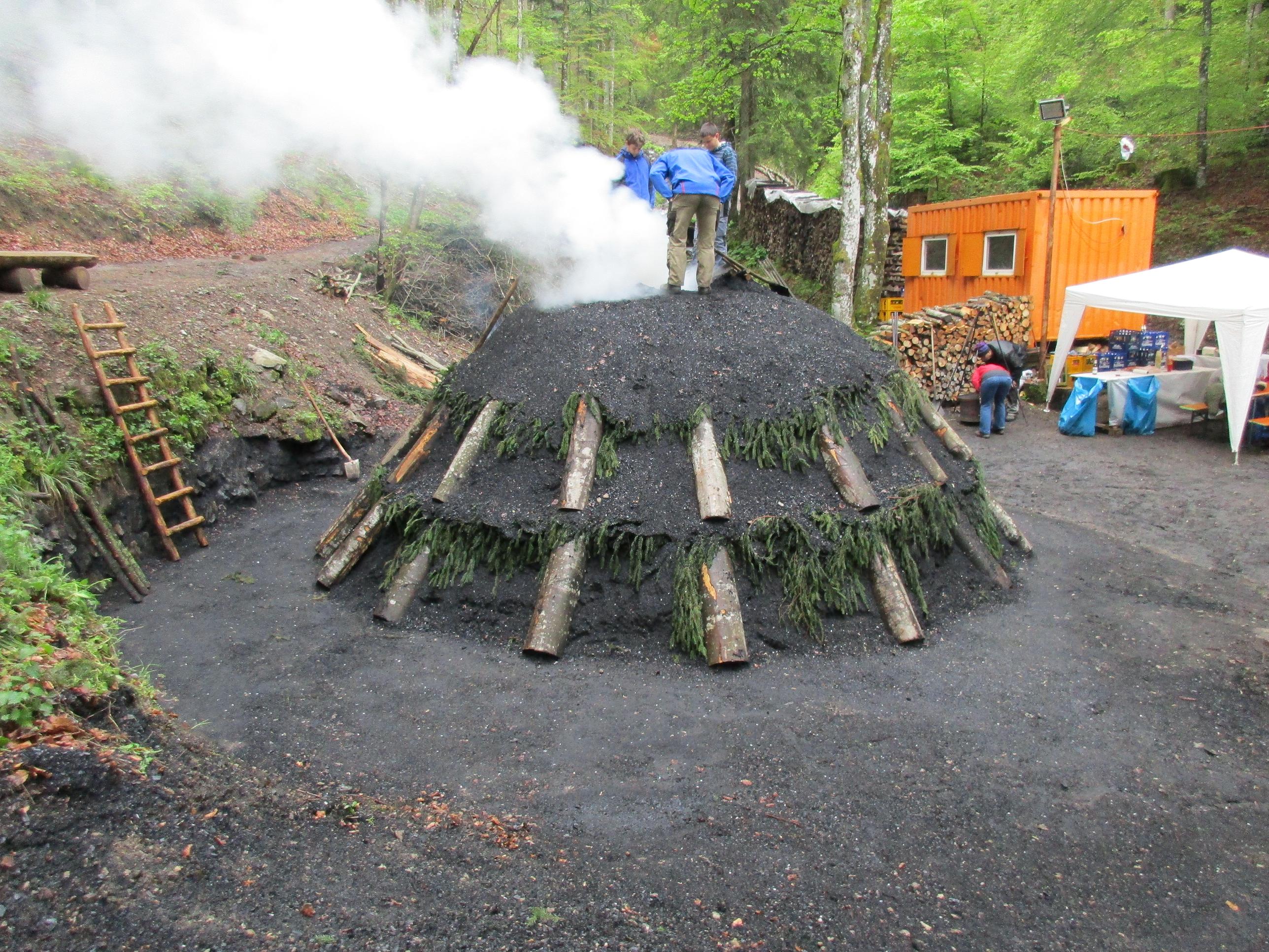 Nachfolgend ein Bild vom Kohlenmeiler welcher direkt am Pfingstsamstag am Morgen oberhalb unseres Besucherbergwerkes in Glut gesteckt wurde.