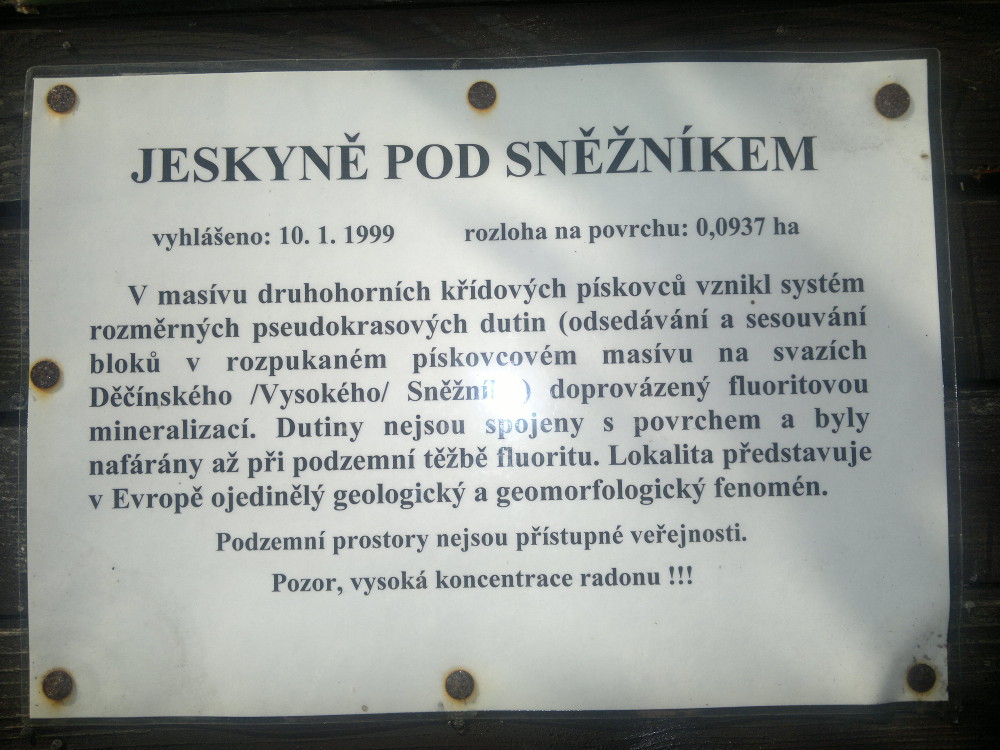CAVE Sněžníkem erklärt: 10. 1. 1999 Fläche:. 0,0937 ha in massiven Mesozoikum Kreide Sandsteine pseudo-dimensionales System von Hohlräumen (e odsedávání und Nutensteine in gebrochenen Sandstein-Massiv an den Hängen Děčínského Nysokého erstellt / Snows Fluorit Mineralisierung begleitet Hohlräume sind Ojen mit der Oberfläche und waren nafárány bis in den Untertagebau von Fluorit. Lage in Europa stellt eine einzigartige geologische und geomorphologische Phänomen. die unterirdischen Räume für die Öffentlichkeit nicht zugänglich sind. Achtung, hohe Konzentrationen von Radon