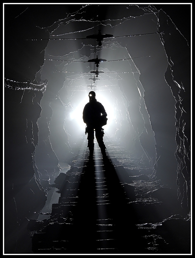 In dieser Strecke in Thüringen ist mir weder der Berggeist noch der Terminator begegnet, sondern nur ein Mitbefahrer. Dieser hatte die Aufgabe, die eigentliche Lichtquelle abzudecken. Ziel war es die feinen Graustufen von tiefschwarz bis leuchtendhell an den Seiten besser zur Geltung zu bringen und damit dem Bild eine klare Tiefenstaffelung zu geben. Verstärkt wird der Effekt durch die Reflektionen an den Schwellen und den Abspannseilen der ehemaligen Oberleitung.