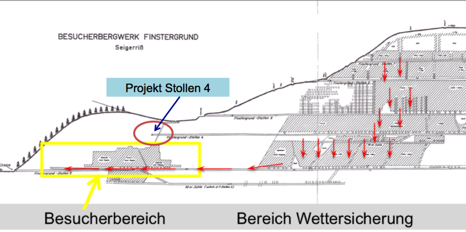 Um in der Grube Finstergrund eine langfristige sichere Wetterführung gewährleisten zu können wurde das Projekt Stollen 4 in Angriff genommen.