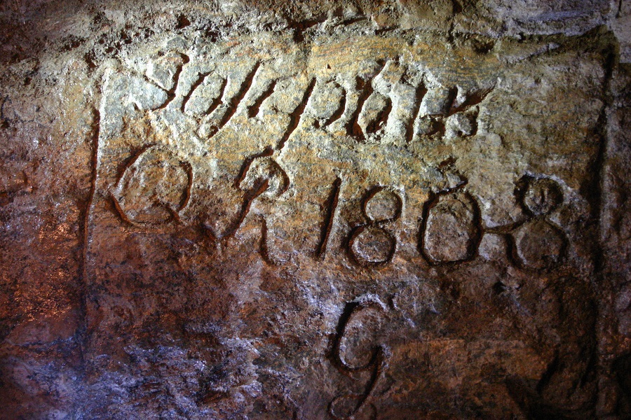 Dieser "Strich" ist ein kleiner Riss im Gestein, wenn man dem Bild glauben darf. Dieser fängt links oben in der Ecke der Tafel an und geht bis zum "p" durch den Schriftzug und kommt bei der Jahreszahl bei der "0" an.