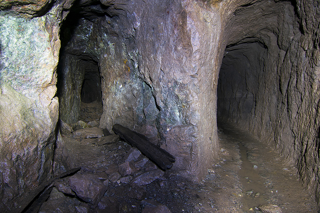 Abzweig im Kupferbergwerk aus dem 18Jhd, vorne noch ein Gerinne aus Holz, rechts im Stollen ein kleine geschlägelte Seige auf der Sohle.