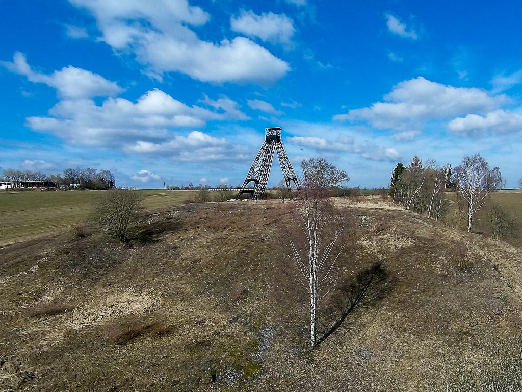 Haldenlandschaft des Burgörner Reviers bei Hettstedt; links das Maschinendenkmal auf dem König-Friedrich-Schacht.
