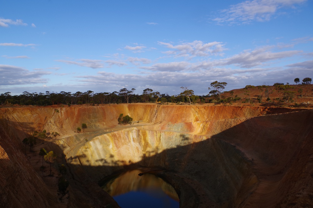 Abendstimmung am Tagebau Achilles mit RC Bohranlage im Hintergrund. Das Bild folgt genau der Laengsachse des Erzkoerpers - goldvererzte gebaenderte Eisenformation (ca. 2.7 Mrd Jahre) mit mafischen und ulramafischen Laven als Nebengstein. Achilles produzierte etwa 20.000 bis 30.000 Unzen Gold.
