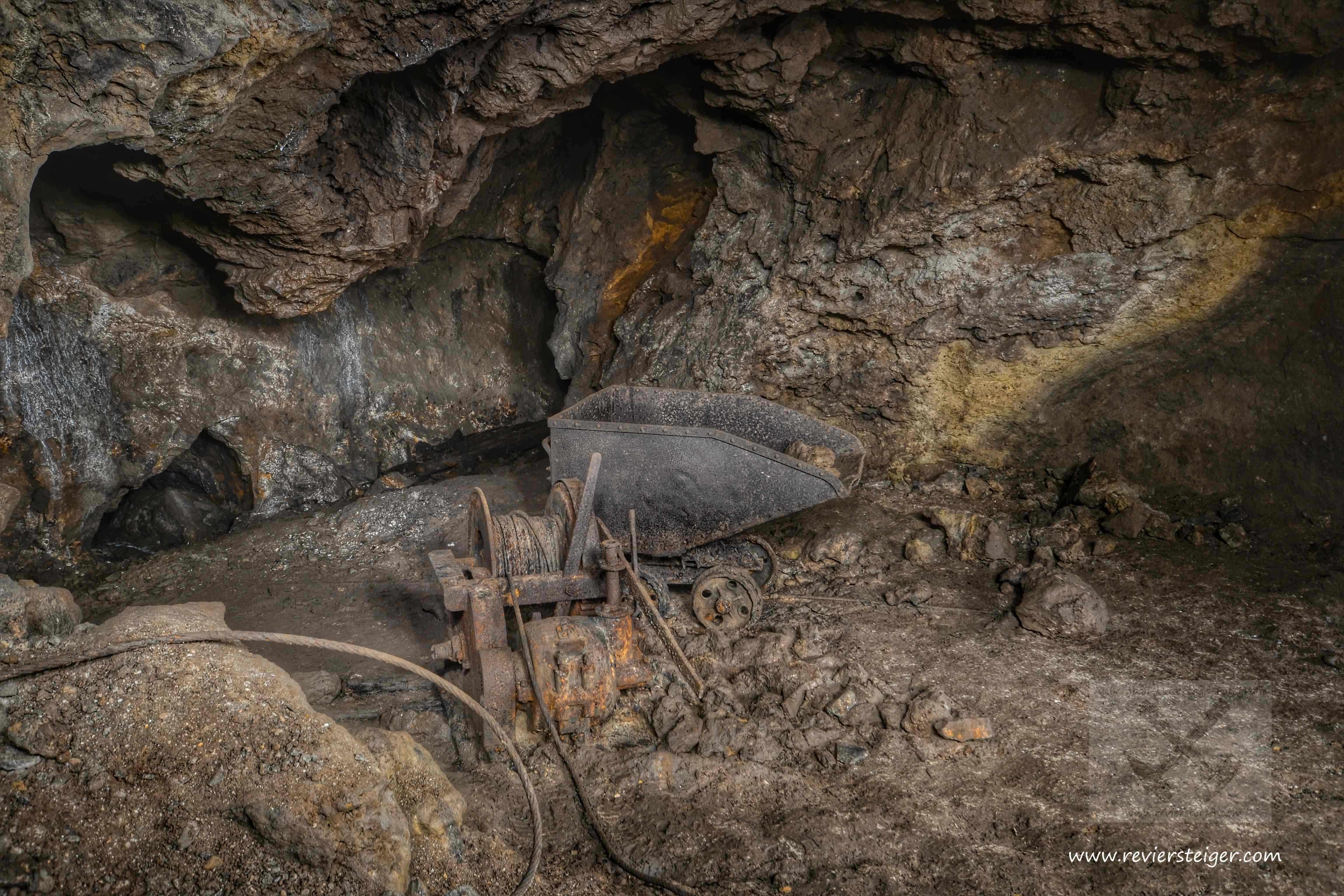 Der alte Scheinwerfer im Bild leuchtet die ersten 5-10m aus. Das restliche Licht kommt von einer Eagtac. Auf dem Grund ist nicht der Stollen zu sehen, sondern die Sohle eines Querschlages von ca. 5m, welcher zum eigentlichen