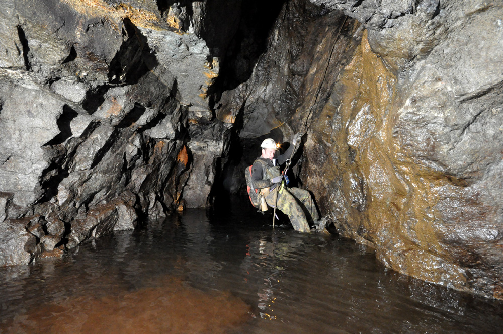 Zweite Gezeugstrecke des Tiefbaus im Schafbreiter Revier. Die Wasserlösung erfolgte mittels der Schächte T (Wasserkunst) und W (Dampfmaschine Watt'scher Bauart). Hier ein farbenprächtig versinterter Bereich des südlichen Flügels, etwa in der Mitte zwischen Wimmelburg und Wolferode gelegen. Die trübe Aussicht ist, dass beide Schächte jetzt zeitnah verwahrt werden sollen!