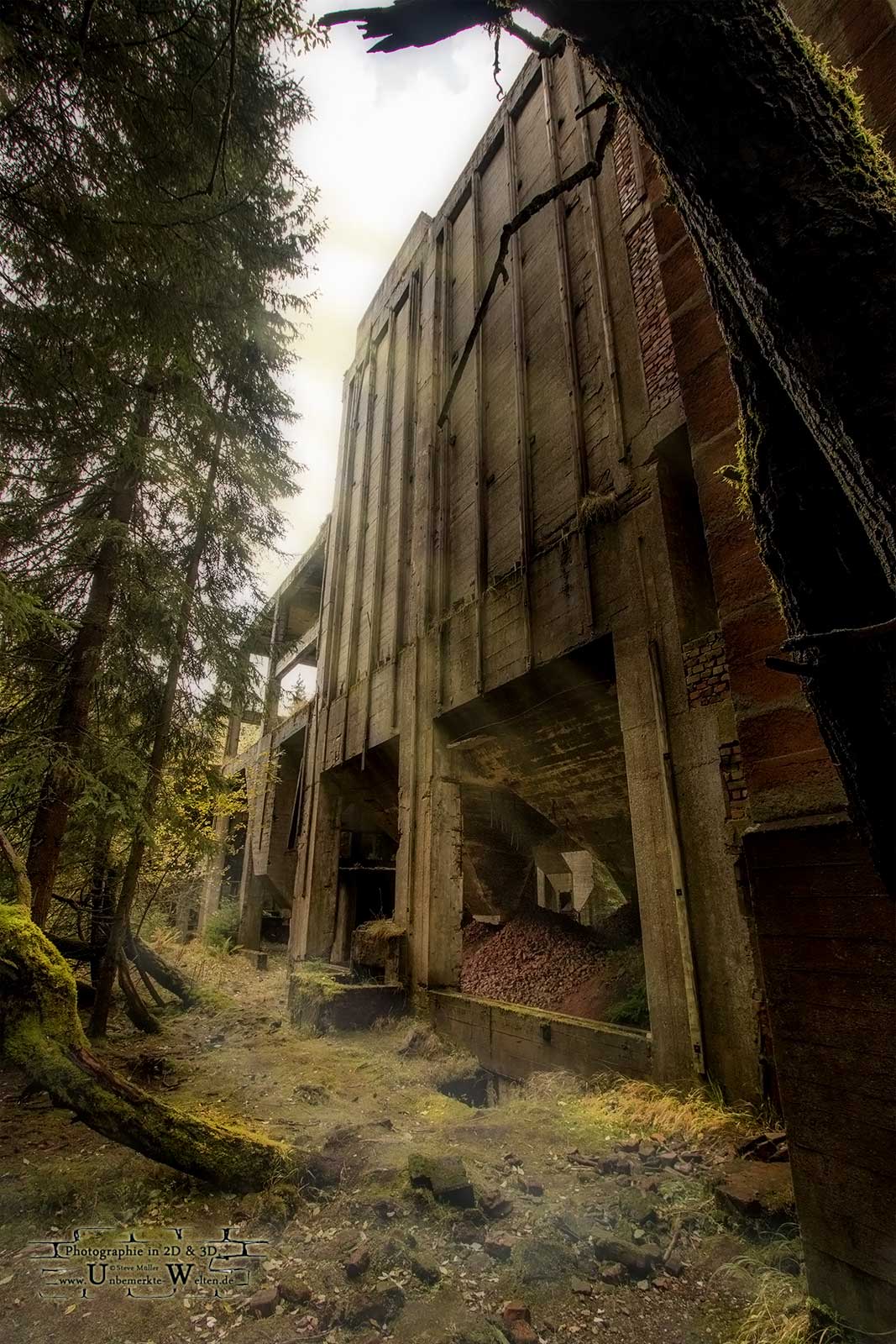 Tief im Wald versteckt, liegen die Ruinen vom Schacht 1 der Zinngrube Rolava. 1939 gründete man die „Zinnbergbau Sudetenland GmbH“. Mit Hilfe von Kriegsgefangenen ging die Anlage erst 1943 in betrieb. Die Gesamtlänge des Streckennetzes wird auf ca. 14km geschätzt. Am 23.05.1945 wurde die Grube geschlossen und geflutet. Lange Zeit hielt sich in der Bevölkerung das Gerücht, dass die Zwangsarbeiter in der Grube zurückgelassen wurden. Das Bild zeigt das imposante Gebäude der Aufbereitung.
