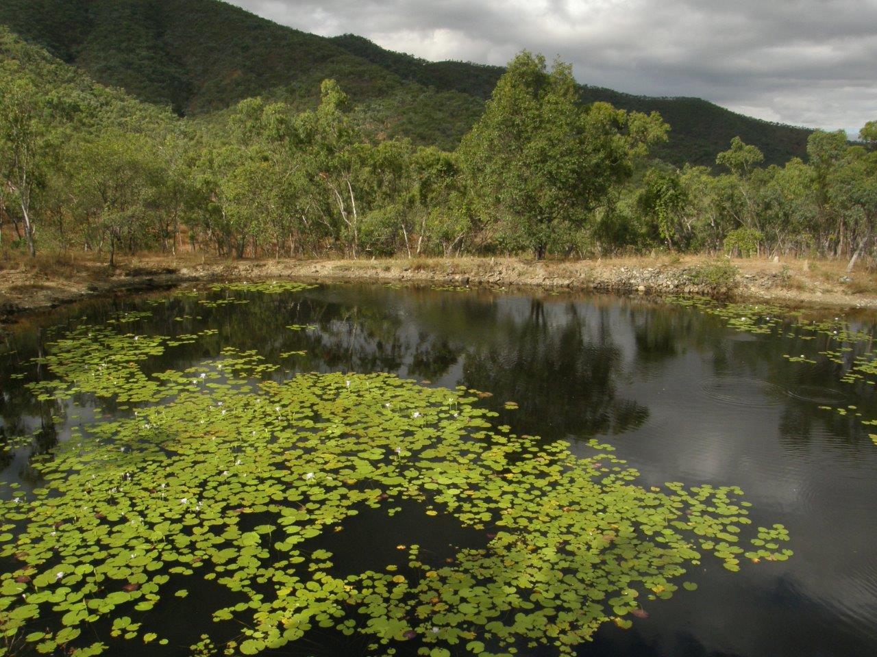 Damm eines kleinen Flussgoldprojektes aus den 1980er Jahren in Nord Queensland, Australien. Die andere Haelfte des Dammes hinter mir ist mit Spuelsand gefuellt.
