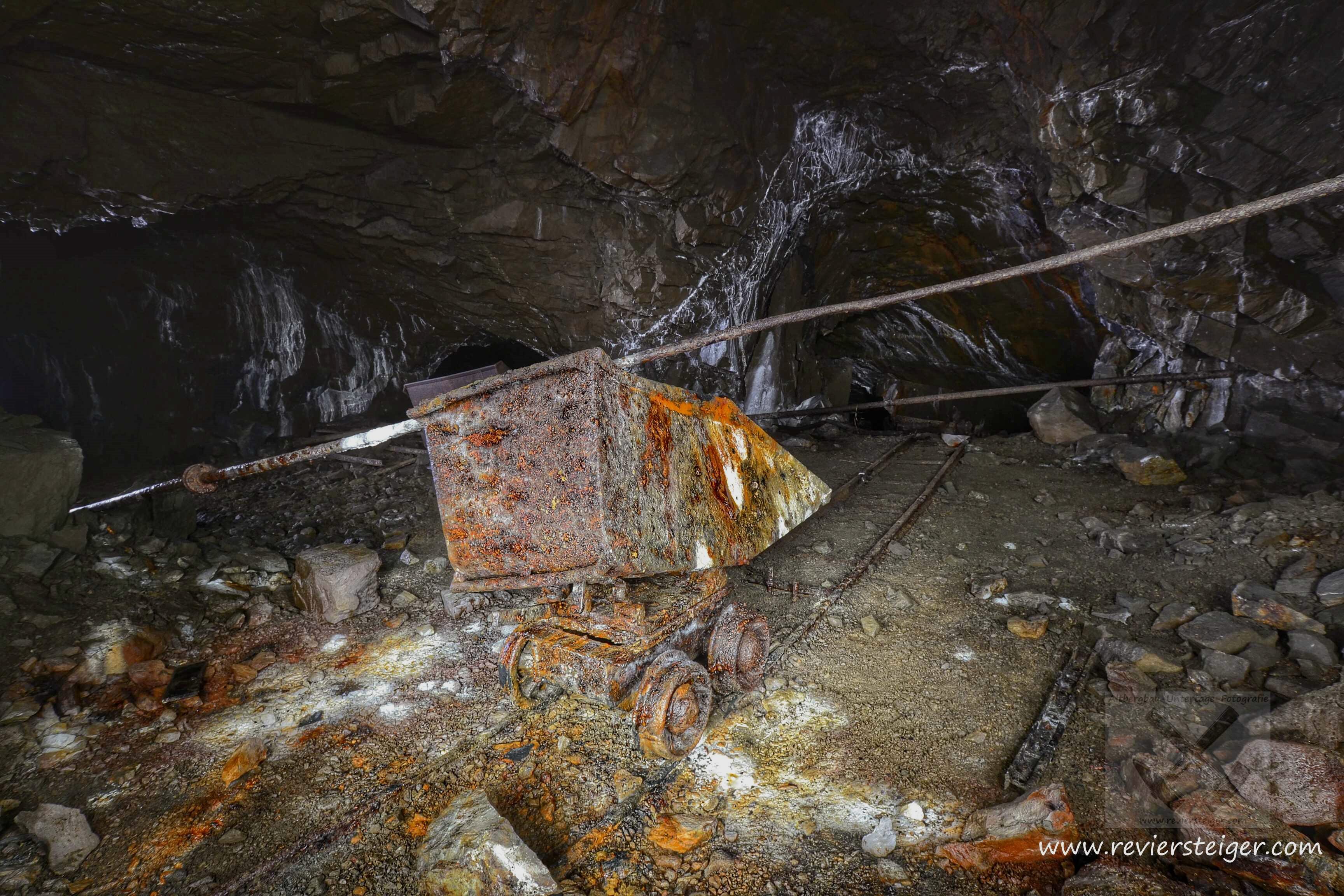 Wenn die Befahrung wieder mal etwas länger dauert und man Untertage mal muß, muß man nur wissen, wo der Kübel steht. Dieses Modell hier hat allerdings schon so ein paar Jahre auf dem Buckel. Die Strecke wo das Ding steht ist um 1857 aufgefahren worden. Der Inhalt selbst ist übrigens auch schick versintert.