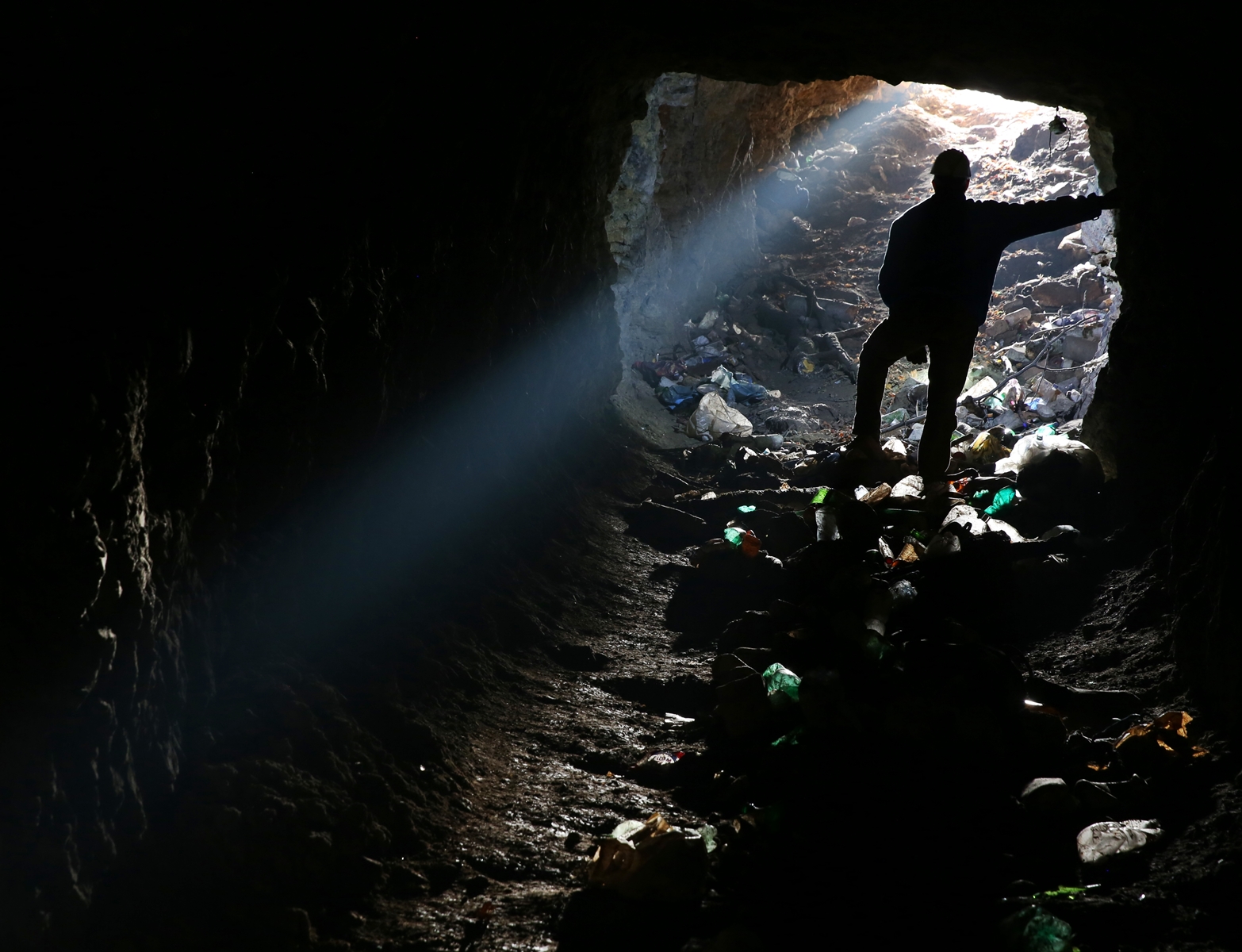 Schrägschacht in einem stillgelegten Kalkbergwerk im böhmischen Karst (český kras), leider war der Schacht stark vermüllt, so dass man hier auf einer Schicht von Schrott und Plaste unterwegs war...