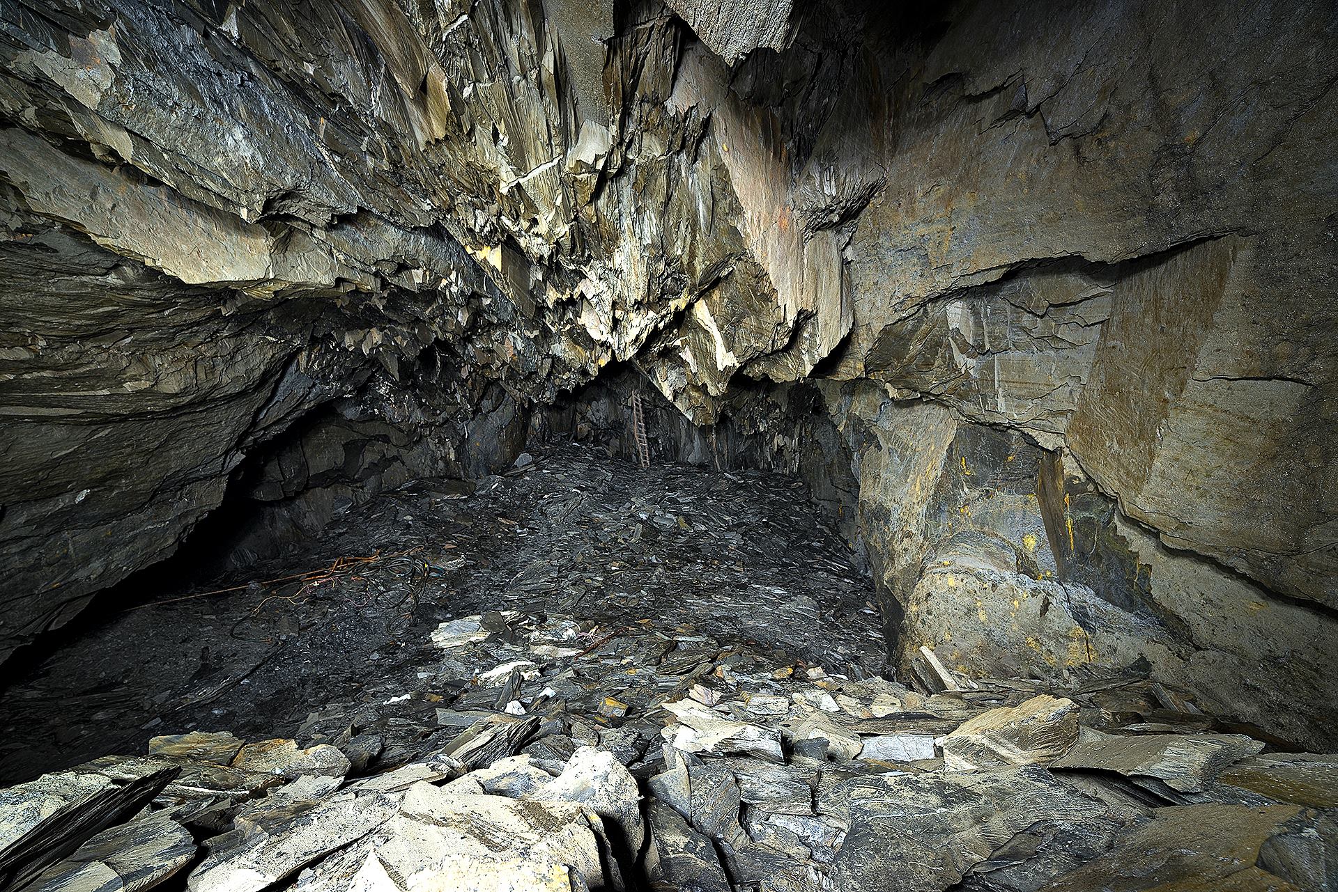 rechts Bohrstrecke mit Firstanker, mitte - stehengebliebener Pfeiler (sollte eigentlich weg sein), links magaziniertes Haufwerk