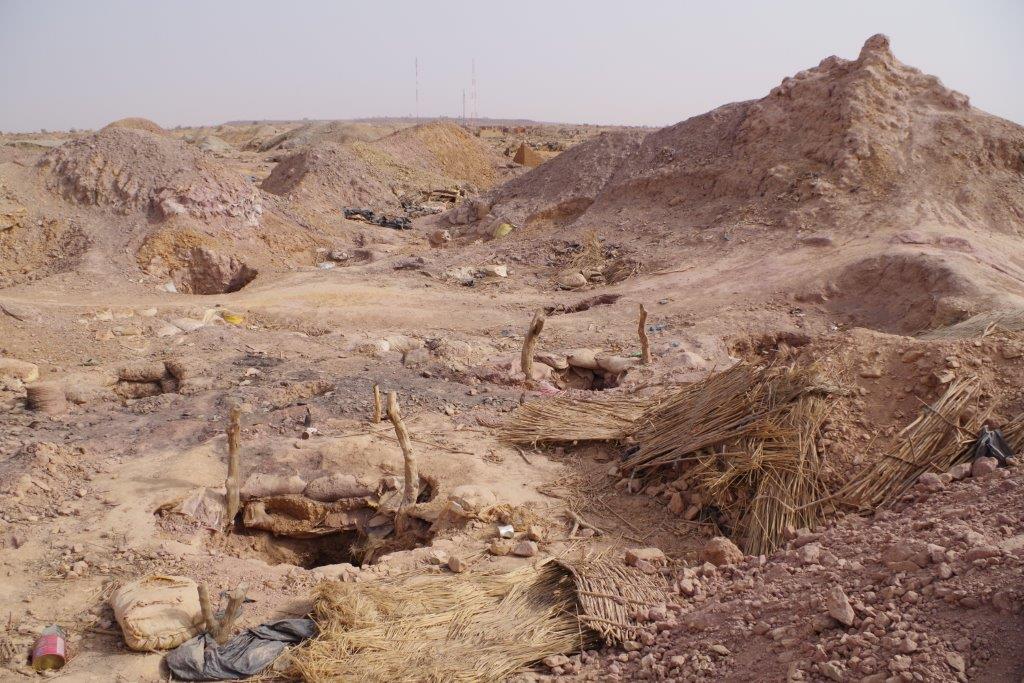 Zwei offengelassene Foerderschaechte (datiert auf der fruehe 21. Jh, Betriebsperiode etwa 2016/17) auf einem Goldfeld im Westen Nigers.