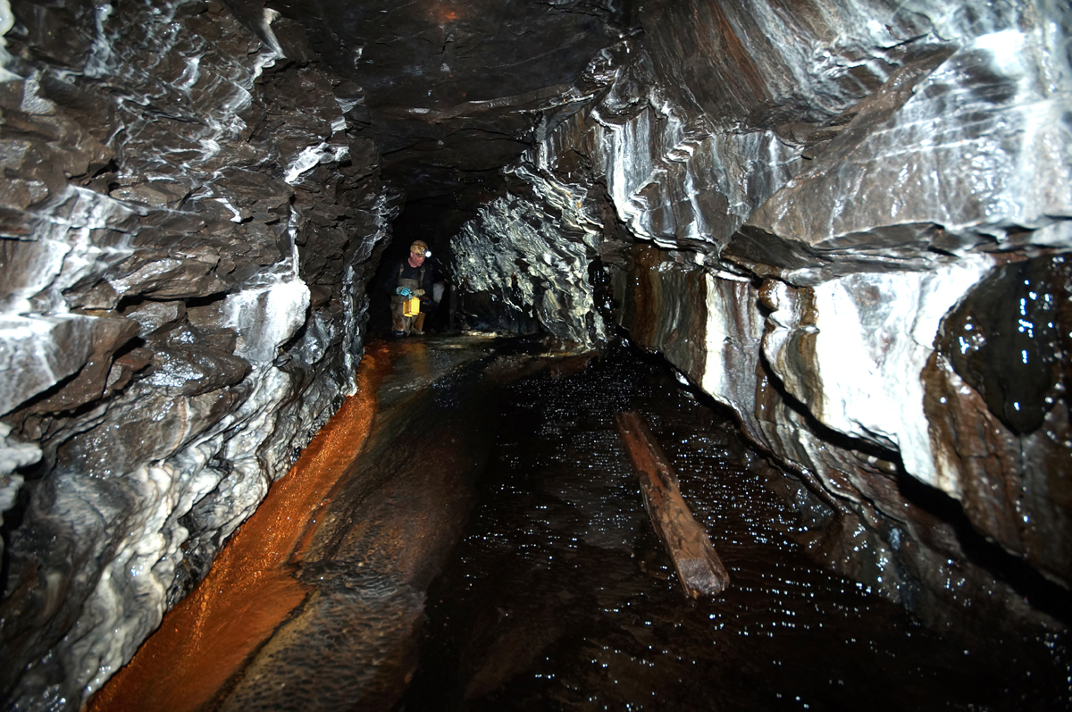 Durch Weitungsbau angeschnittener Stollen sowie ein Kalksinterwasserfall im Besucherbergwerk Fischbach an der Nahe (RLP).