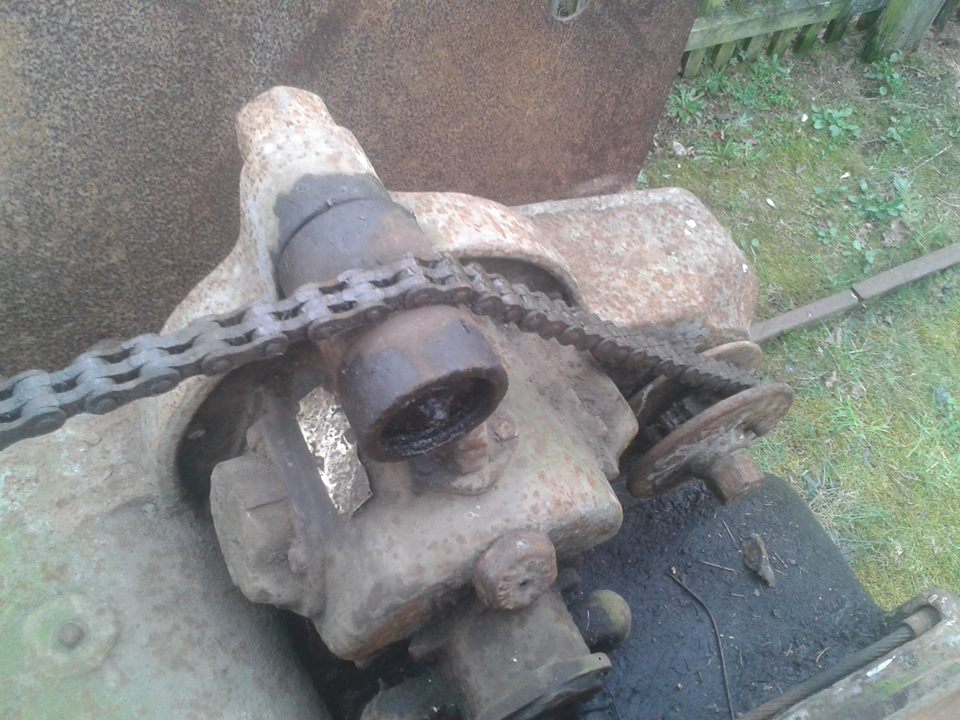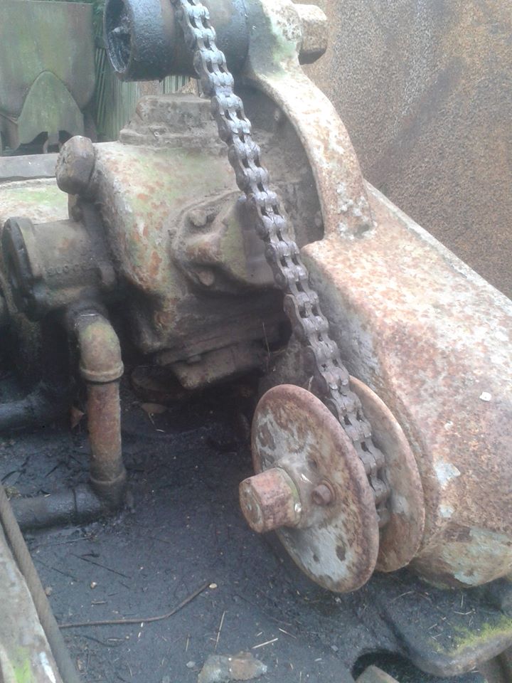 Hier sieht man das Fahrgetriebe.Der Antrieb erfolgt zunächst untersetzt auf eine Welle.Von dieser treibt ein 1:1 Kettenantrieb dei 2 Achse an. Somit Allrad...