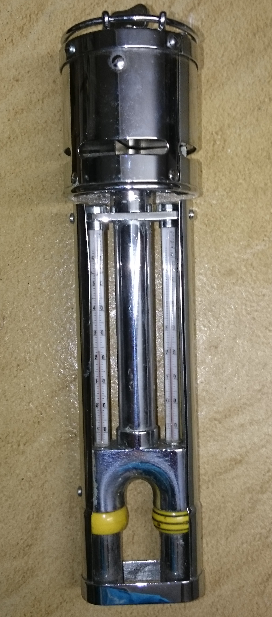 Das ist ein Aspirationspsychrometer nach Aßmann, ein etwas altmodisches, aber physikalisch bedingt sehr präzises Meßinstrument für Lufttemperatur und rel. Luftfeuchte. War bzw. ist bei allen Wetterfröschen, Klimatechnikern und allen, die rel. Feuchte langsam aber sehr präzise messen mußten, Referenzinstrument. Wenn das im Bergbauumfeld genutzt worden ist, dann vielleicht weniger Grubenwehr als von den Leuten, die sich täglich um die Bewetterung im normalen Betrieb kümmern mußten. Kannst Du ungefähr einkreisen, was für Bergbau das gewesen sein kann? Irgendwelche Herstellerschilder (vom Meister Fuess persönlich eventuell sogar?)