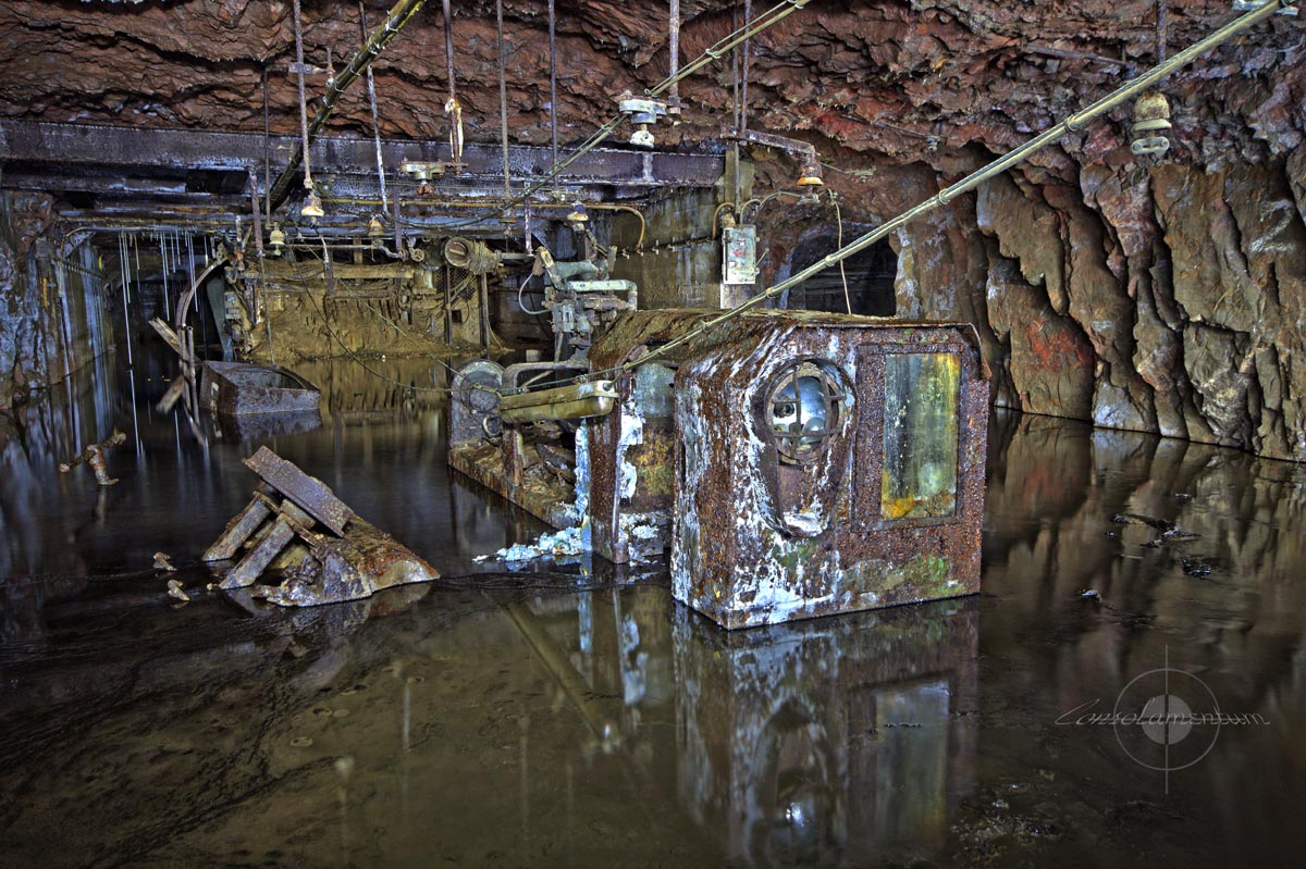 Wetterstrecke in einem ehemaligen Eisenerzbergwerk mit schön übersintertem Stoß und ebenso verziertem Stromverteiler.