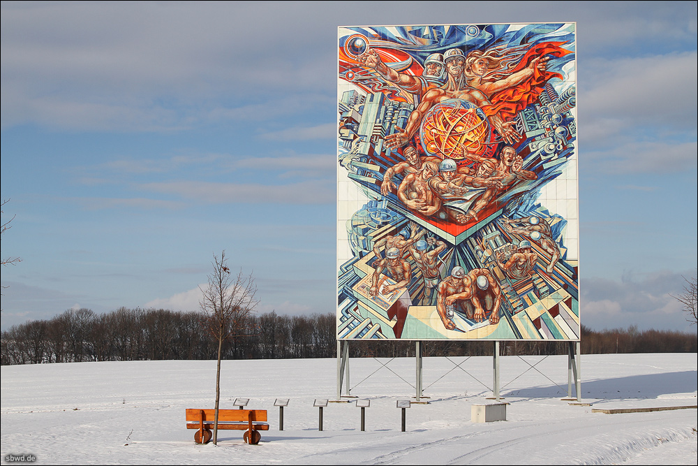 Mehrfach wurde ein Wandbild gezeigt, gemalt in einer Größe von 12 x 16 Metern von Werner Petzold. Enthüllt 1974 am Bürogebäude des Wismut-Bergbaubetriebes Paitzdorf, wurde es dort 2006 vor dem Abriss wieder abgebaut, restauriert und als größtes freistehendes Bild mitten in freier Landschaft erneut aufgestellt.
