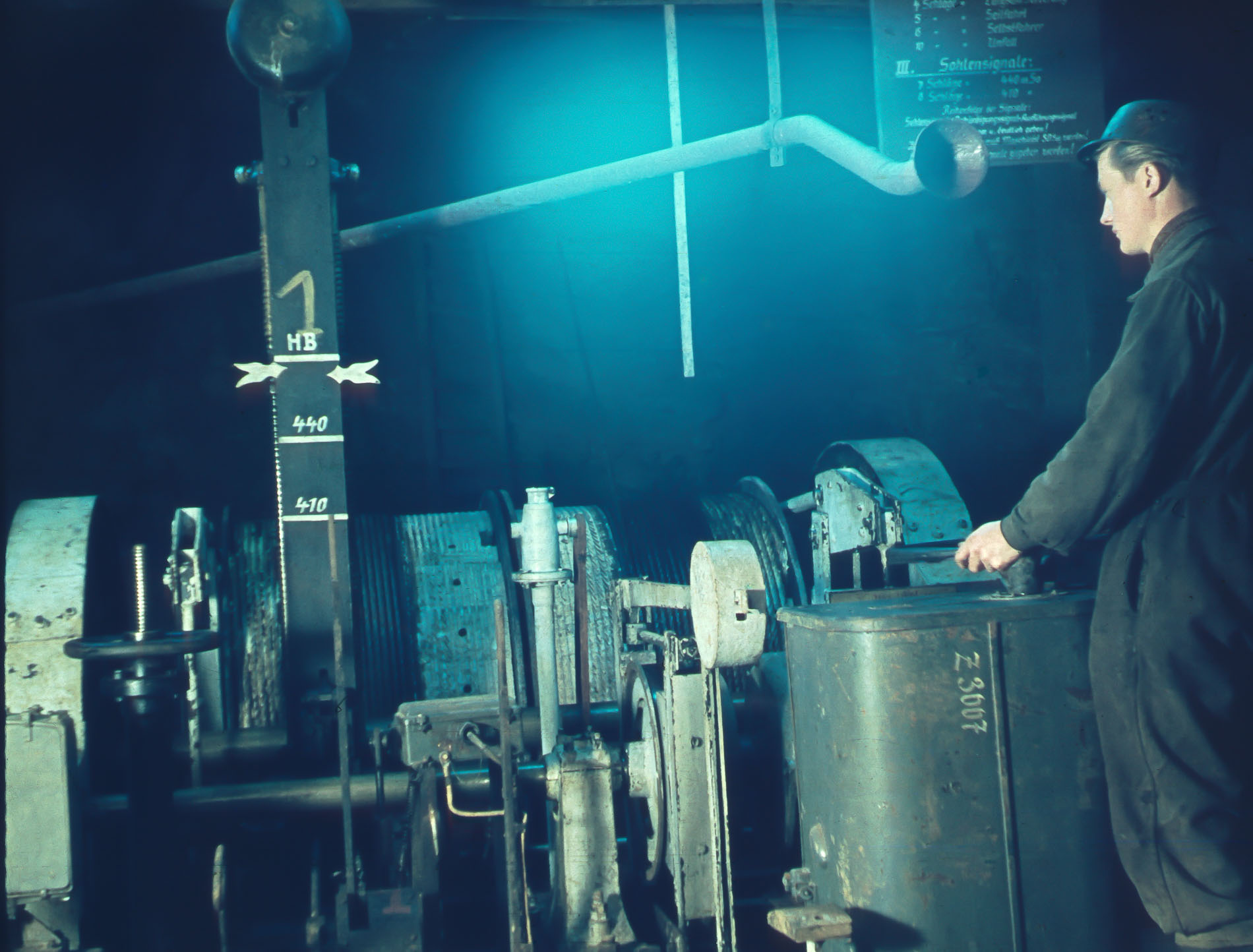 Das Bild ist bitte außer Wertung, aber zur Info. Es ist nicht von mir aber ich darf es zeigen, es ist ein Halbbild einer Stereoaufnahme von Fritz Schlotte. Er war Steiger in der Wolframitgrube Zschorlau ,,Bergsegen 3". Das Bild zeigt die Fördermaschine vom Blindschacht auf der 470m Sohle, es ist vermutlich 1955 entstanden.