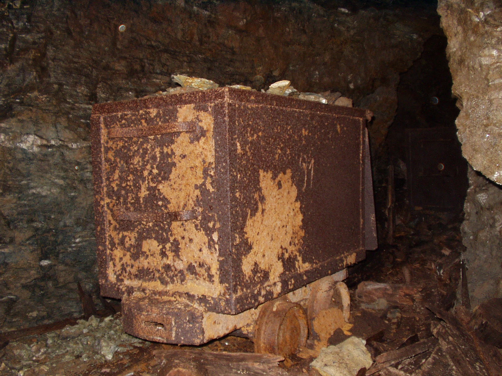 Reste eines "Englischen Förderwagens" auf dem Froschmühlenstollen-Querschlag, zu datieren auf 1908 (Dank an Thomas Wäsche). An eben dieser Stelle wurden seit 1805 "Berge" (= taubes Gestein) in Teile der Wimmelburger Schlotten verkippt, die damals unter Wasser standen und in ihrer Ausdehnung noch gar nicht bekannt waren.