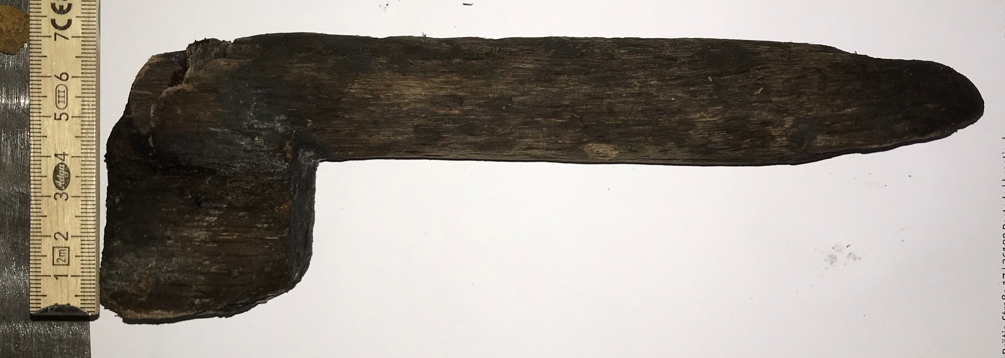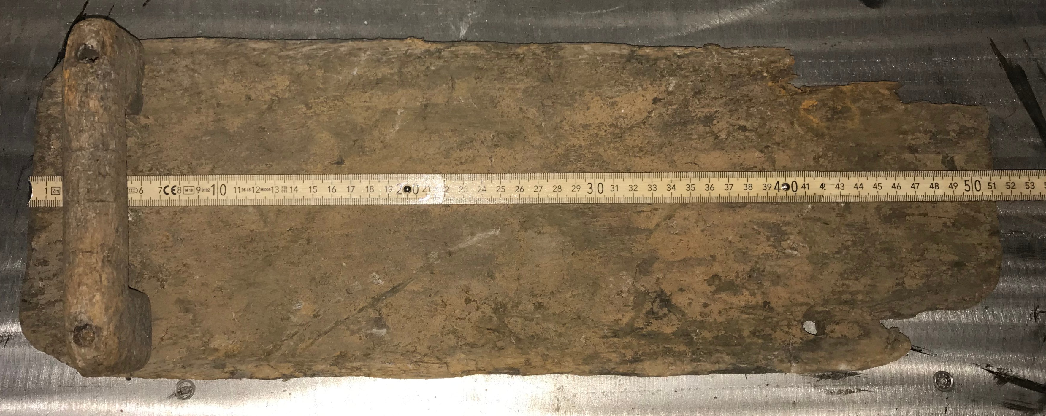 Nr. 2 : Armbrett aus Pappelholz mit den Abmaßen 510 mm x 180 mm hörer durch den Trocknungsprozess bedingt abgefallen. Ist aber so zusammengehörig. Dieses Armbrett hat im unteren Bereich auch löcher die die selben Abmaße aufweisen wie die oberen für den Griff.