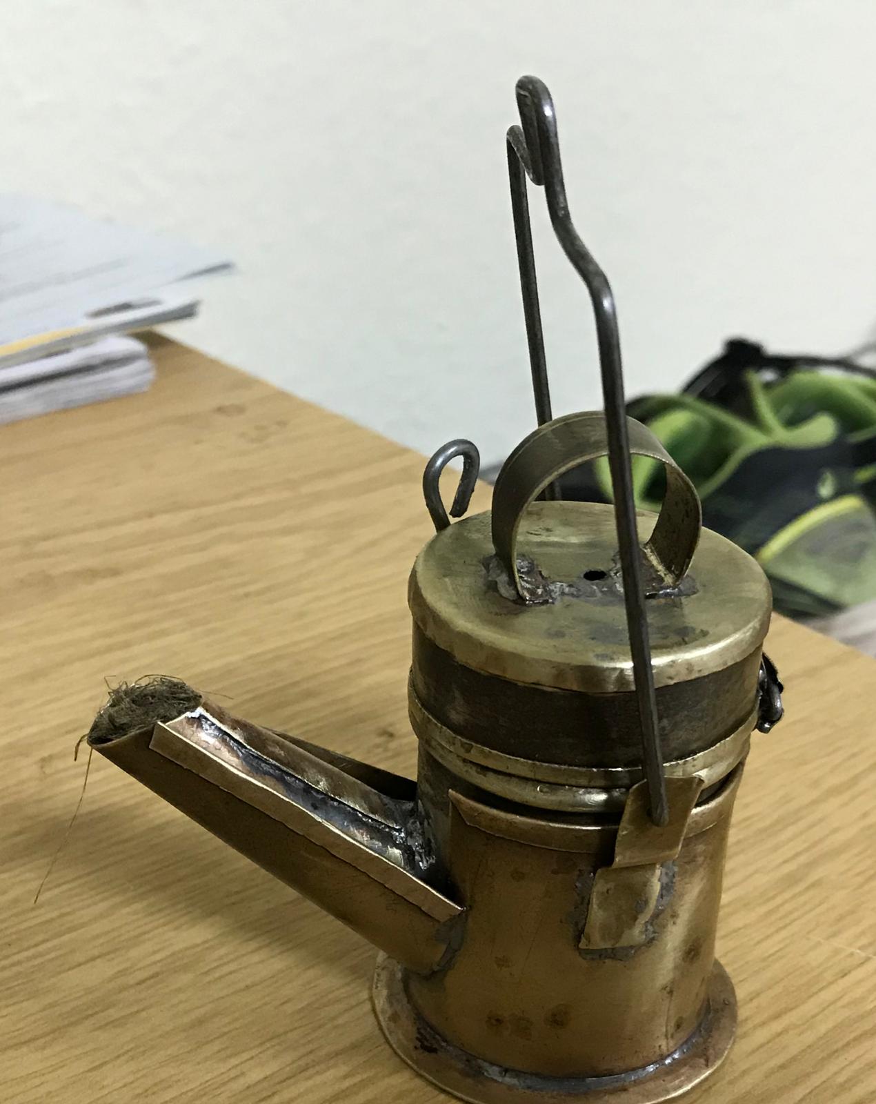 Ich danke dir für dein Lob. Vielleicht hast du ja mitbekommen das wir experimentell den Abbau aus dem Jahre 1885 nachgestellt haben. Was uns allen auffiel, ist wenn die Lampe nicht voll mit Hanf ist tropft das Öl beim fortbewegen extrem raus. Das Öl wird zu einen Teil in der unteren Schale aufgefangen zum anderen landet es als kleiner brennender Tropfen auf der Erde. Ist die Lampe voll mit Hanf und bis zur hälfte mit Öl gefüllt ( die hatten bestimmt nie eine volle Lampe ) passiert nichts. Ich weiss das es von diesen noch Größere im Original gab sie dienten als Streckenlampen und sind sehr selten.