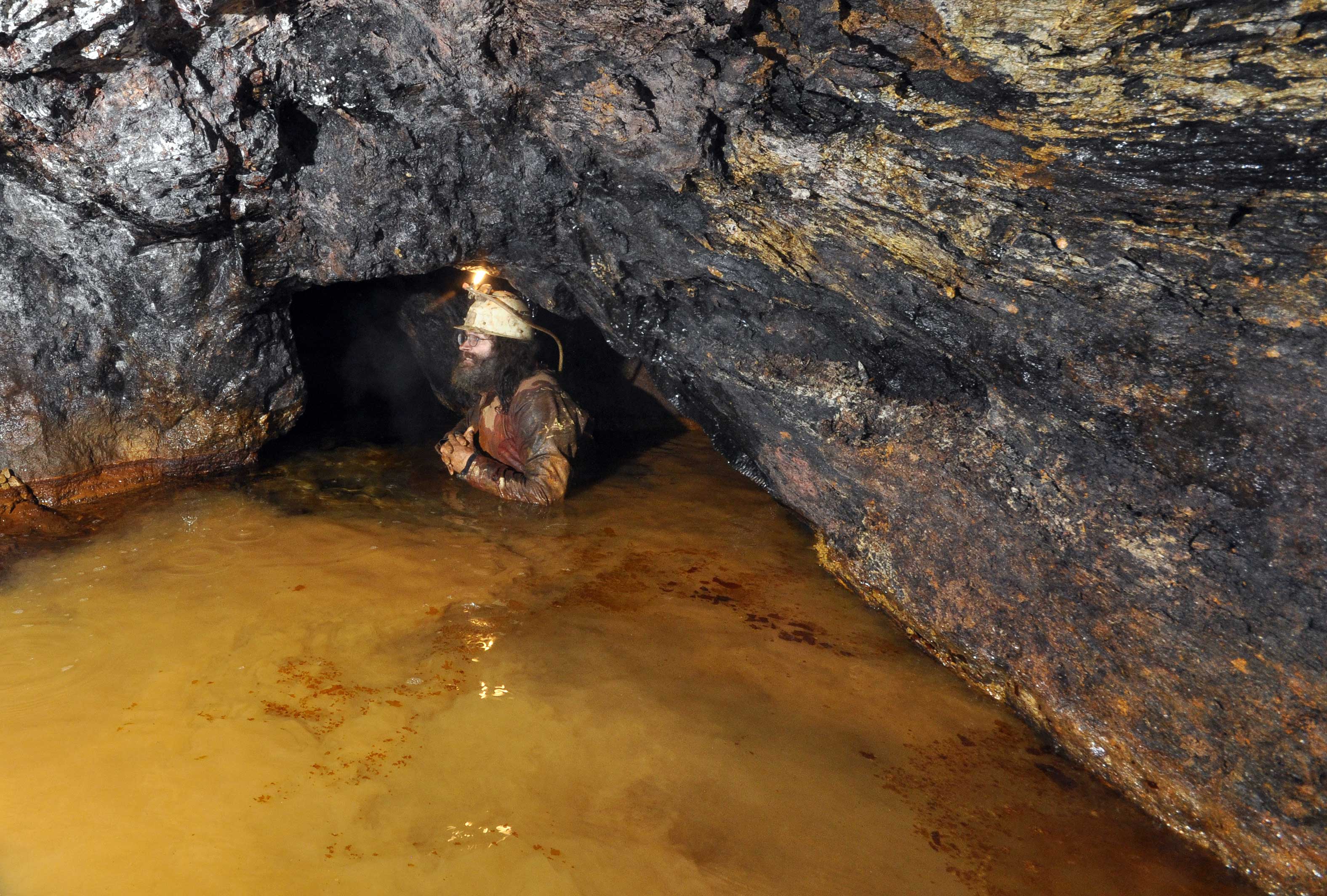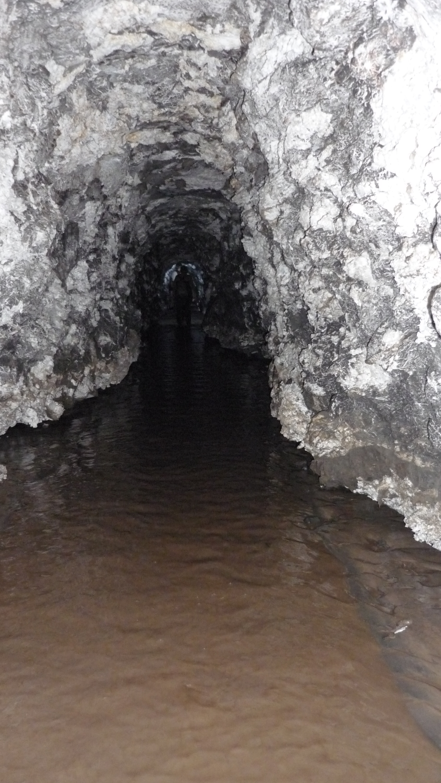 Der Förderstollen diente dazu das gewonne Erz aus dem Tagebau in die Aufbereitung zu bringen. Jede Menge Ocker ist da durch die Befahrung mobilisiert.