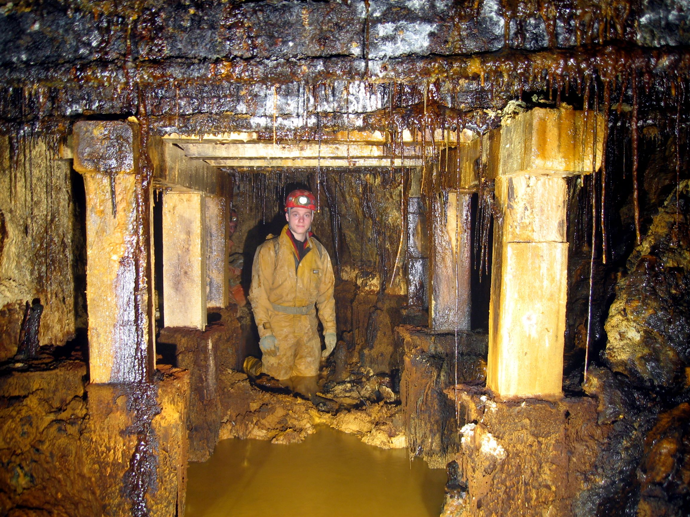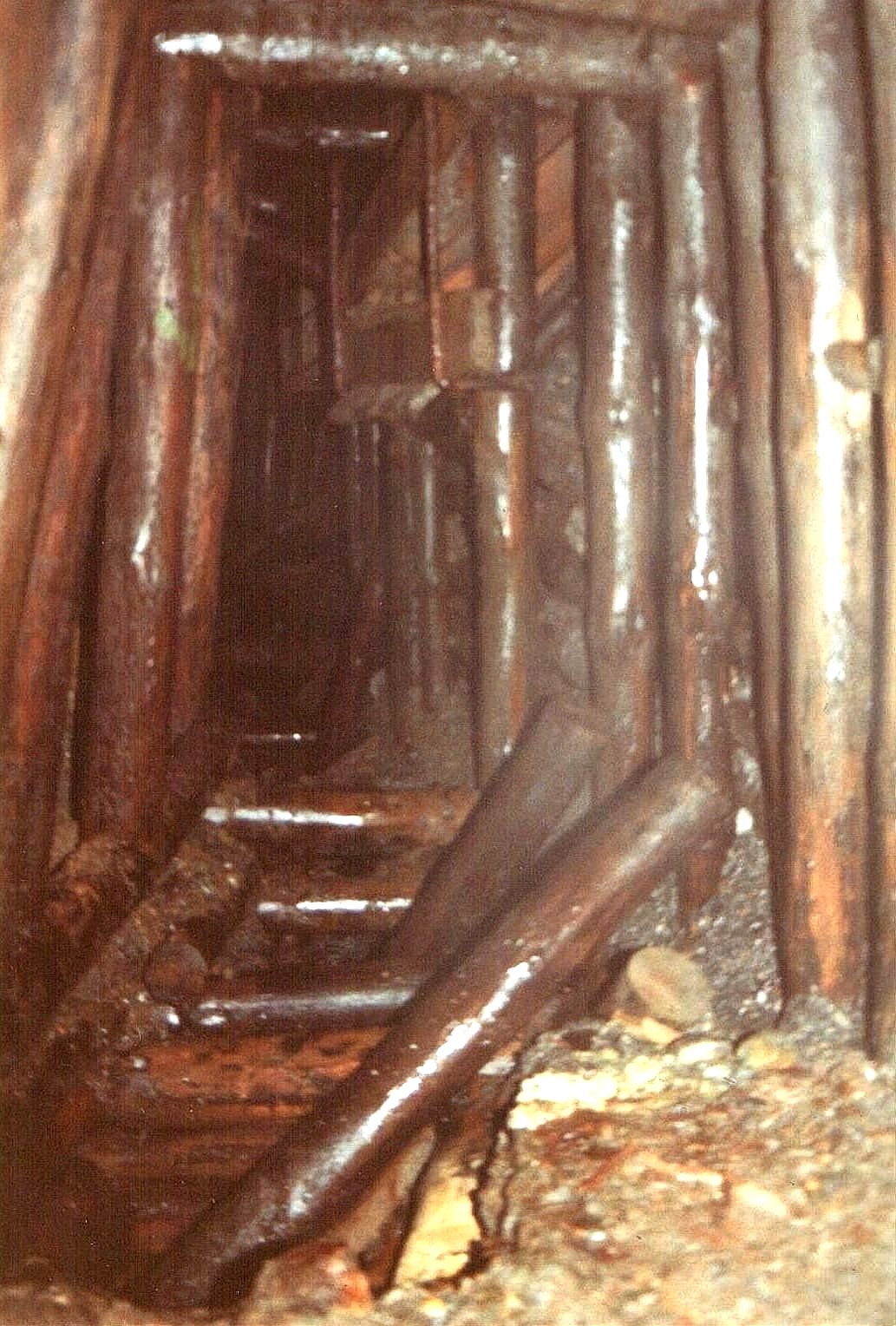 Alter Wismutbergbau im Erzgebirge. Analogphotos sind halt nicht so schön, an der Stelle aber nicht mehr wiederholbar. Türstockausbau im Erzgang mit durchgeschossener Sohle und Erzrolle.