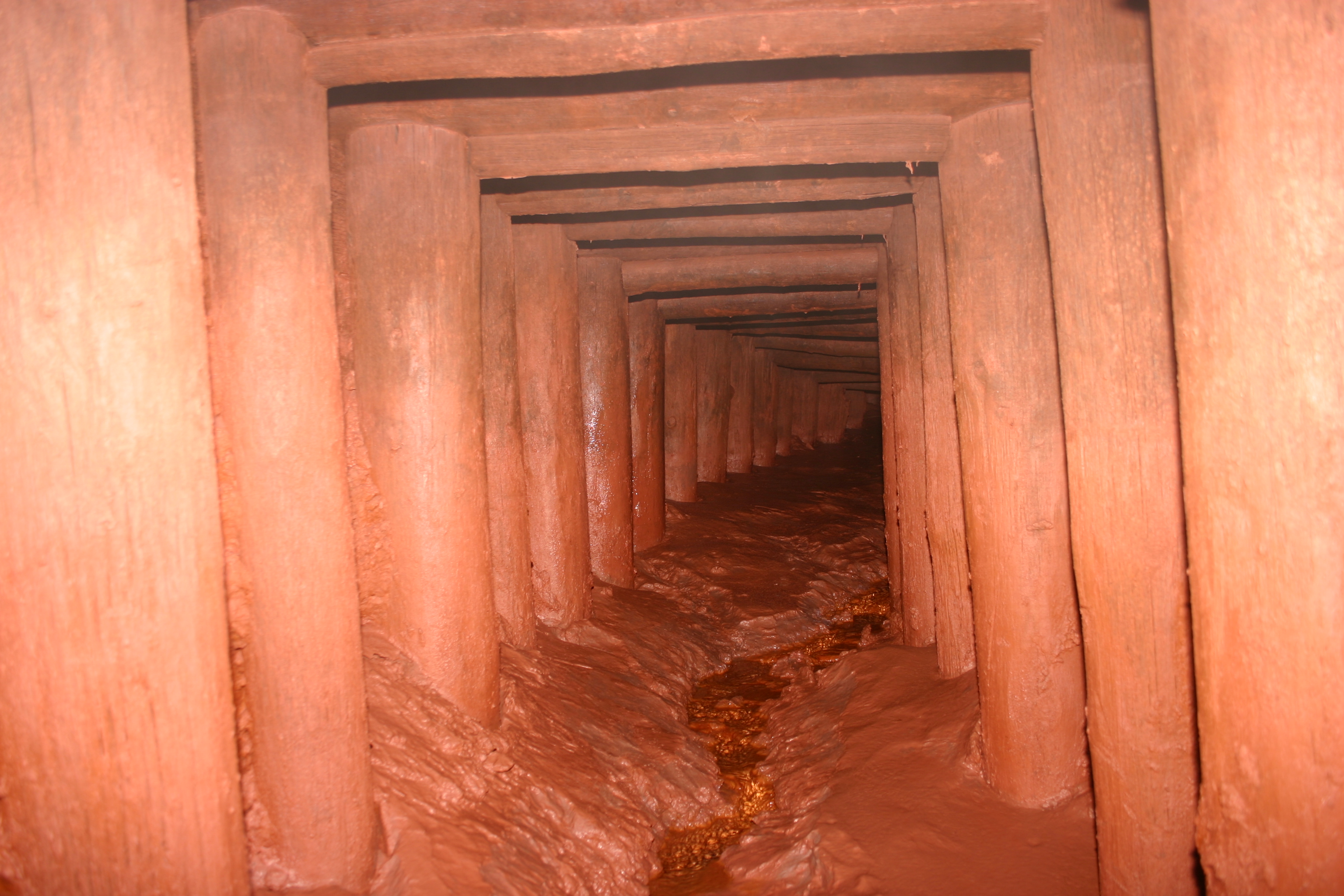Liegengebliebene, teils durch Gebirgsdruck gequetschte Holzröhren eines Pumpensatzes zur Entwässerung des Tiefbaus unter dem Gonnaer Stollen; westlicher Stollenflügel (westlich des Carolus-Sachchtes im Heiligenborner Revier). Nach Aktenlage zu datieren auf die Zeit um 1825.