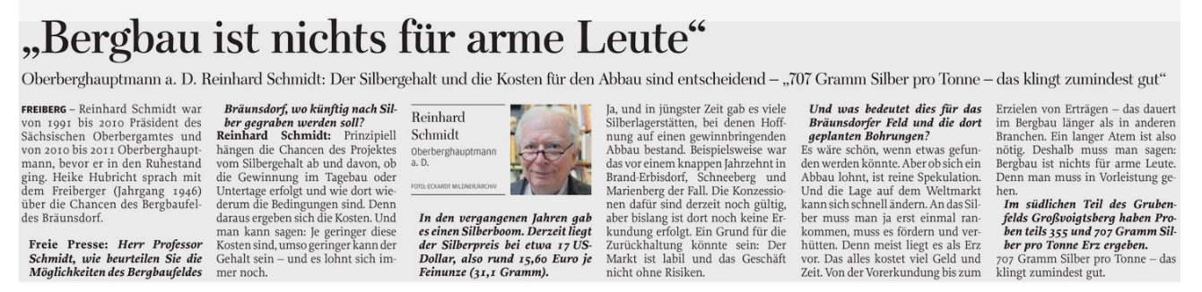 Kein Statement mehr, sondern von mir. Bohrbeginn 7. Juli. Gestern lagen die Ergebnisse vor. In 7 bis 10 Jahren könnte mit einem Bergwerk begonnen werden. Die Jungs sind super. Allerdings muß die Geschichte von Freiberg neu geschrieben werden. Bergbaubeginn im 11. Jahrhundert. Mit Mathe hat man es auch nicht so. 11. bis 19. Jahrhundert = 750 Jahre. Mit Wissenschaft, sie epithermal, auch nicht. Der Bergbau wurde ja auch nicht 1873 eingestellt (Deutschland hat auch keinen Silberstandart verlassen), sondern 1913. Das ist glaube ich 20. Jahrhundert. Ganz eingestellt wurde der Bergbau auch zu diesem Zeitpunkt nicht. 1937 wieder intensiviert und bis 1968 fortgeführt. Naja. Bergbau in der DDR, wen interessiert das schon. Ach so. Das Revier wurde nie mit modernen Methoden untersucht. Logisch. In der DDR hatte man ja von so etwas keine Ahnung. Wer trotzdem Interesse hat, sollte die Aktie jetzt kaufen. Ist gerade schön billig.