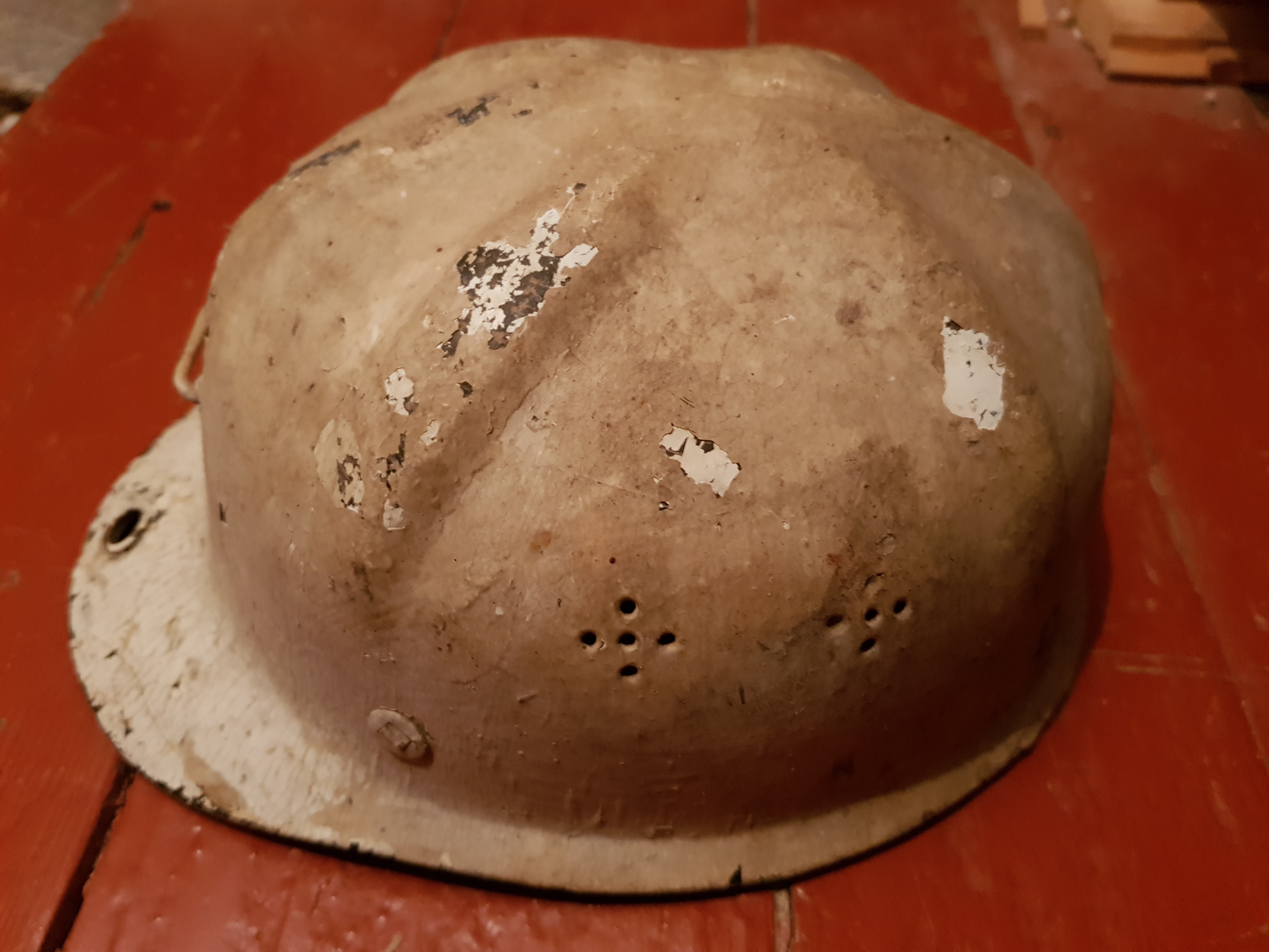 Die Helmbefestigung deutet ja darauf hin, dass schon elektrische Grubenlampen verwendet wurden. Da es aber eine selbstgebaute Halterung ist, müsste der Helm noch aus der Zeit der Karbitlampen stammen.