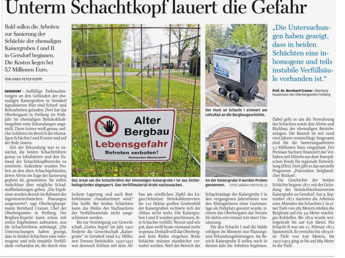 Kaisergrube II wird saniert. D.h. die alten Gebäude sind inzwischen abgerissen, das Gelände wird saniert, der Schacht wird bis auf 20 m aufgewältigt, gesichert und anschließend angebohrt und die Röhre verpresst. Die Abwetterstrecke stand in Ziegelgewölbe und wurde bereits mit Beton verfüllt. Nur ein Gebäude und das angebaute Wohnhaus bleibt stehen, da es genutzt wird.