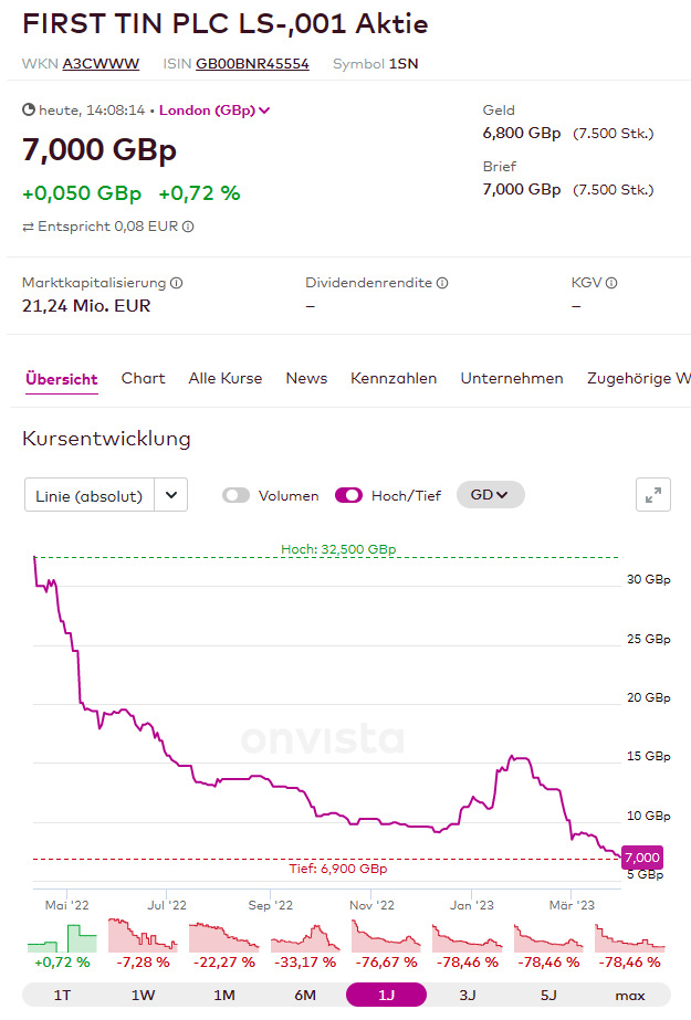 Der eine stellt hier nur mal den Aktienkurs der Firma First Tin Plc ein. Wenn gewünscht auch das Interview mit Thomas Bünger von heute 12 Uhr. Saxore ist ja eine 100%ige Tochter der Firma.